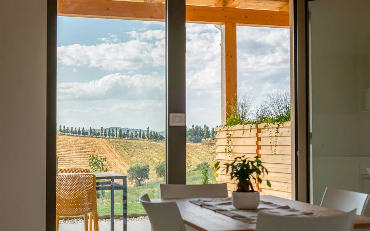 The vacation apartment comes equipped with essential amenities for a comfortable stay. The kitchenette, located in the entrance area, includes a dishwasher, two induction hot plates, a microwave, and a dining table. The bathroom is furnished with a shower, bidet, and toilet. Air conditioning and forced-air heating are available throughout the unit for your comfort, although there is no separate heating option. The patio, spanning 20 square meters, is furnished with terrace furniture and offers a beautiful panoramic view of the countryside. Additional facilities include a hair dryer and free WiFi internet access. Reserved parking is available at the house.