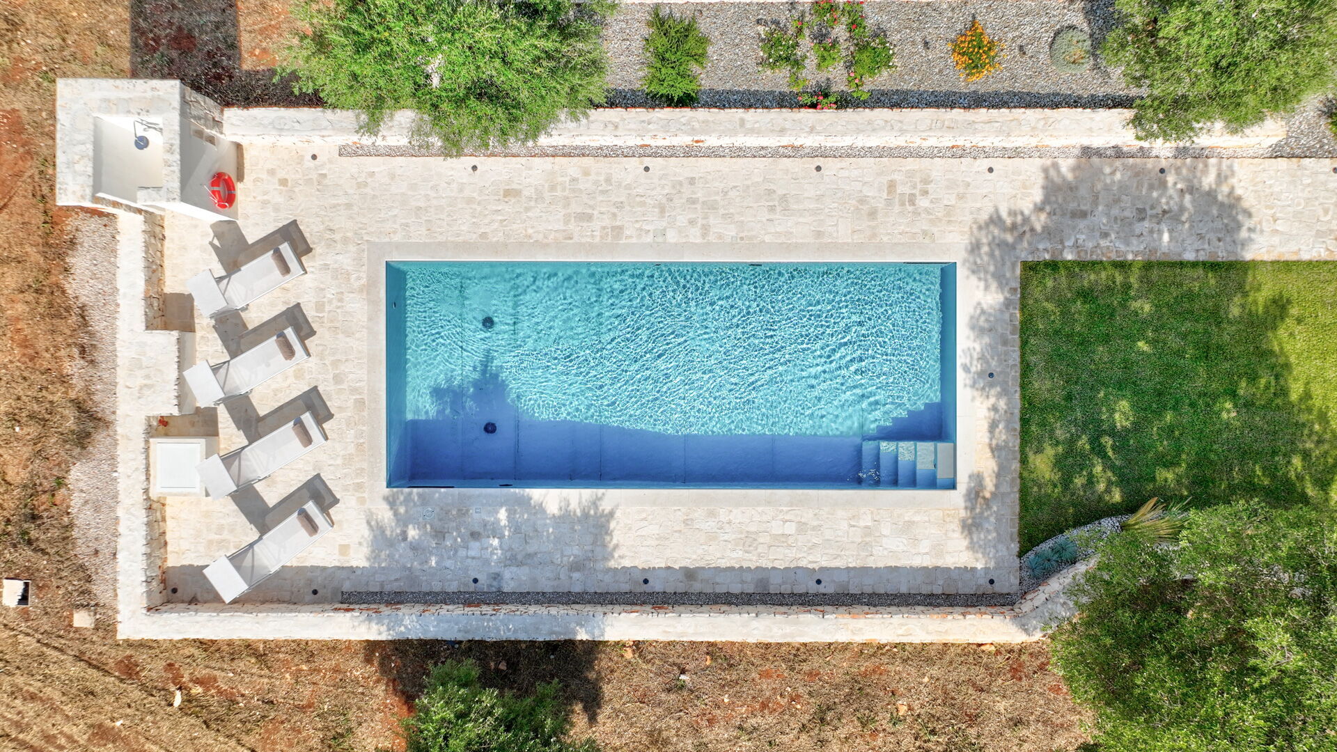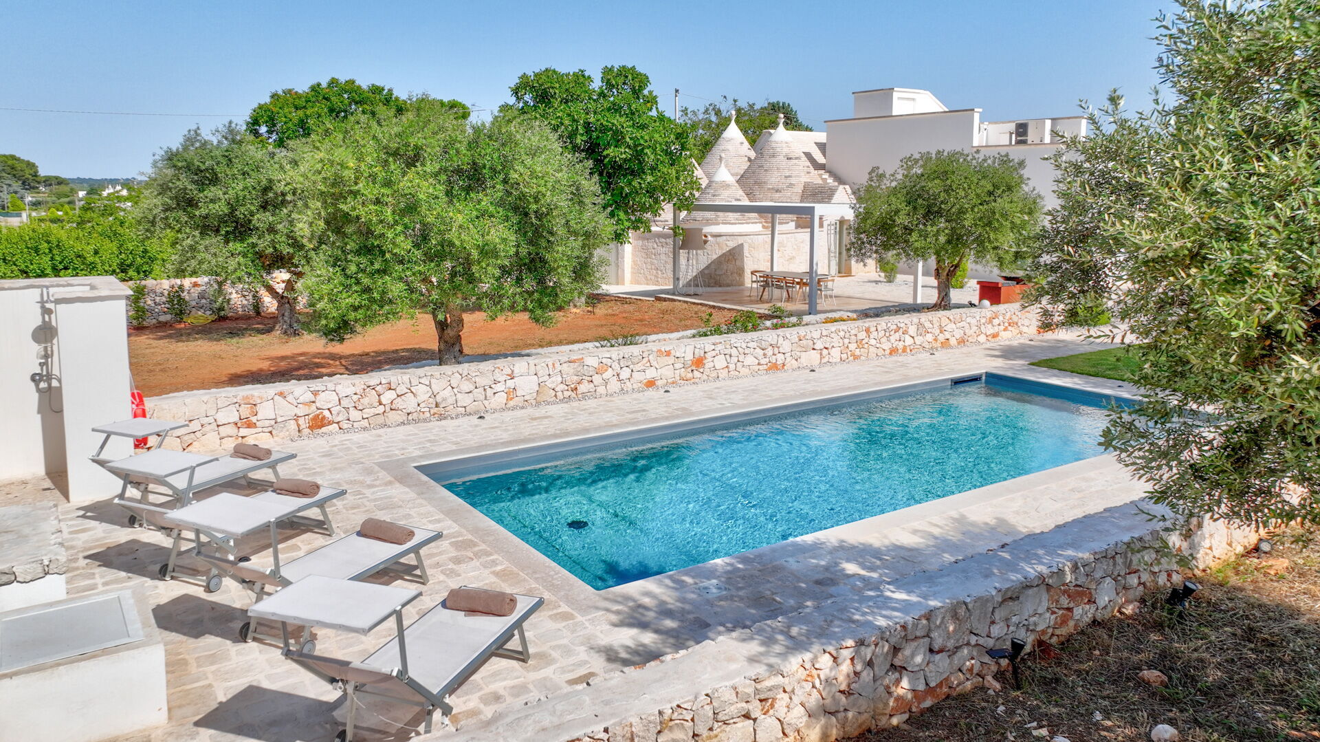 Outside of Trullo Under the Apulian Sky, you will have at your disposal a wonderful swimming pool with hot and cold showers and sun loungers, a barbecue, sun loungers and deck chairs. Both in the front and in a private position in the courtyard, two covered patios with tables and comfortable seats will be at your disposal.