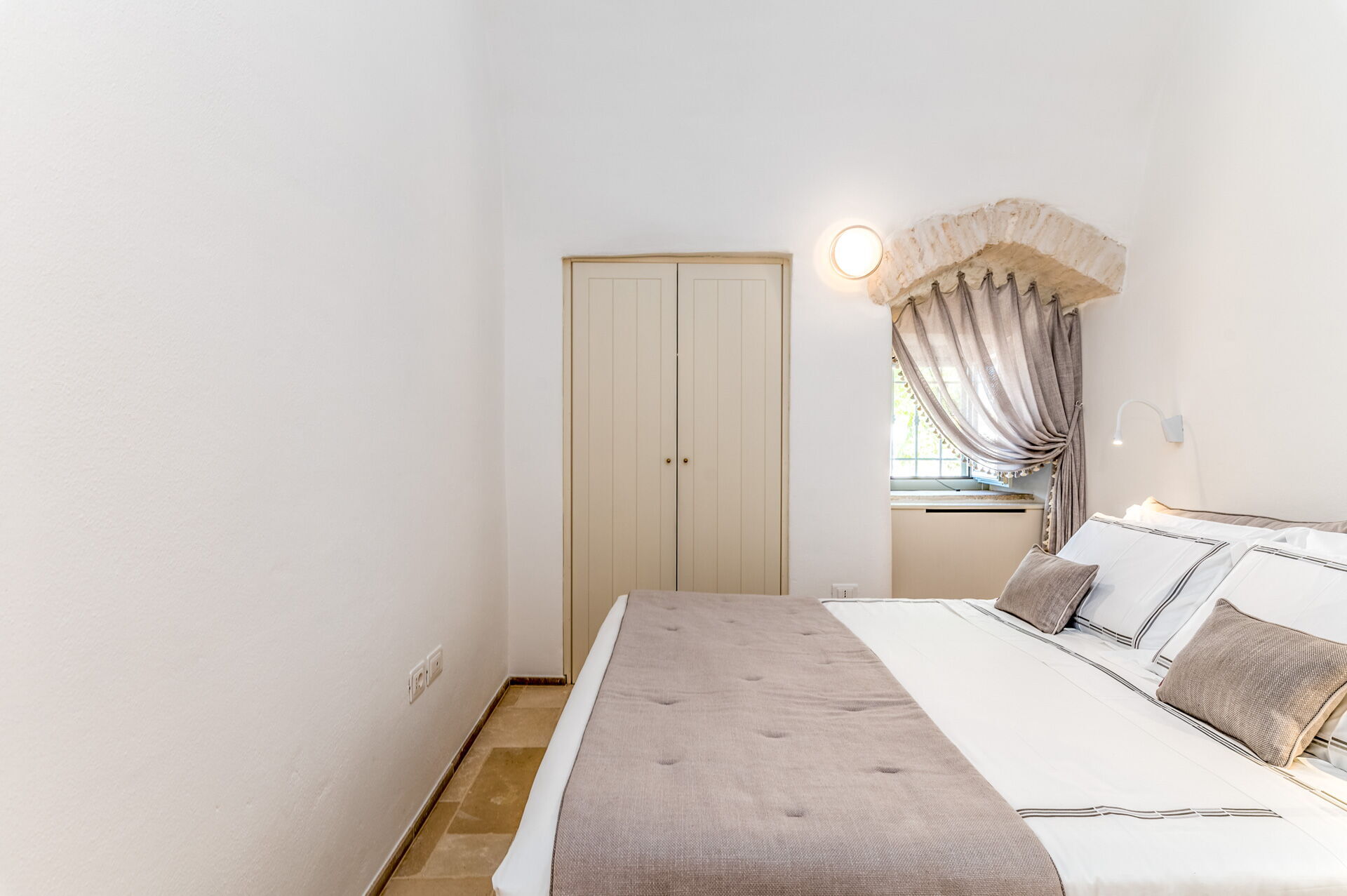 Bedroom 1 (12 m2): air conditioning, safe, WIFI internet, double bed (length: 190m, width: 160m), television, exit to the garden.