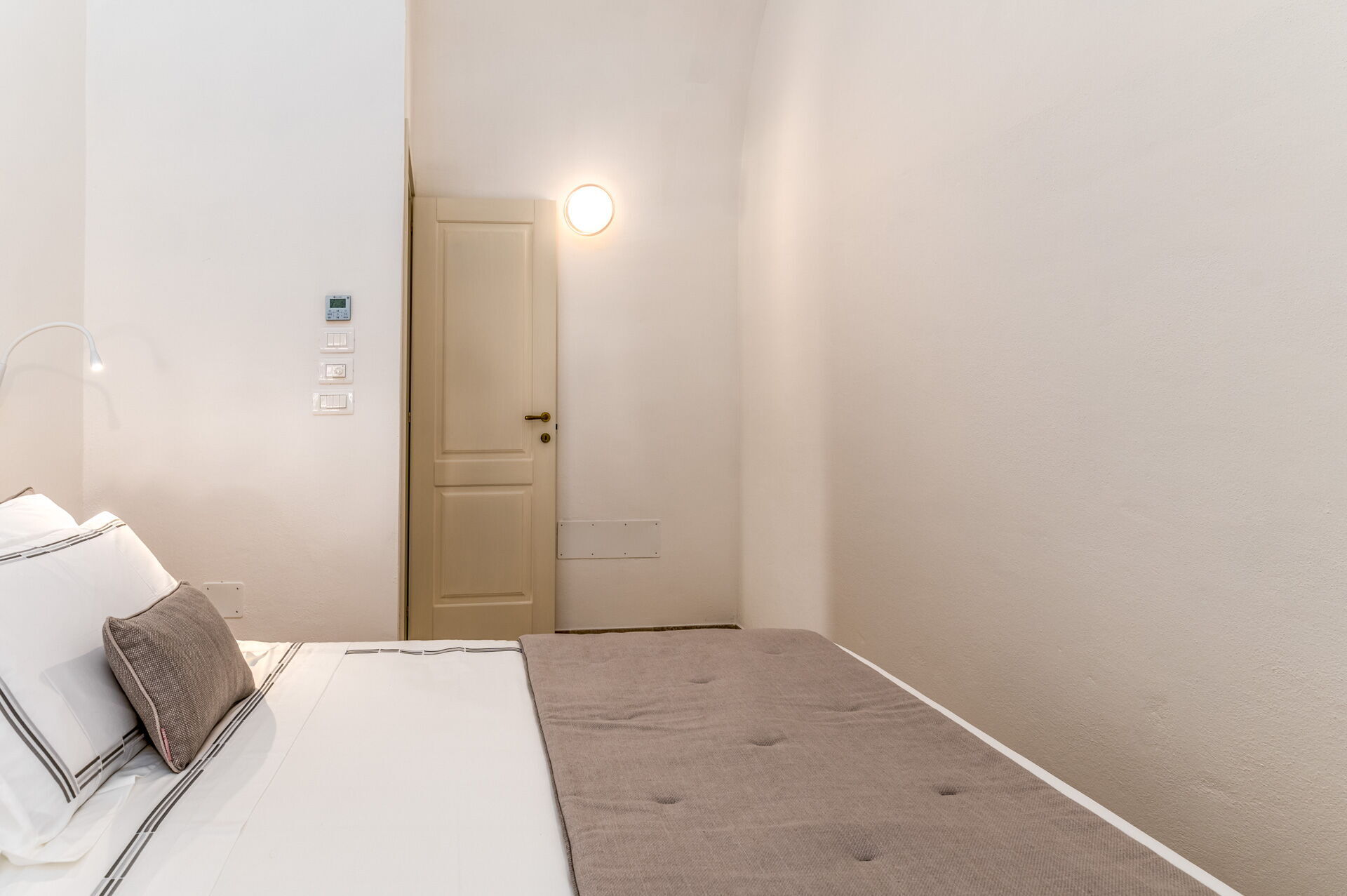 The double bedrooms are furnished with a built-in wardrobe, a bed with a wooden headboard, bedside tables and light points for reading.