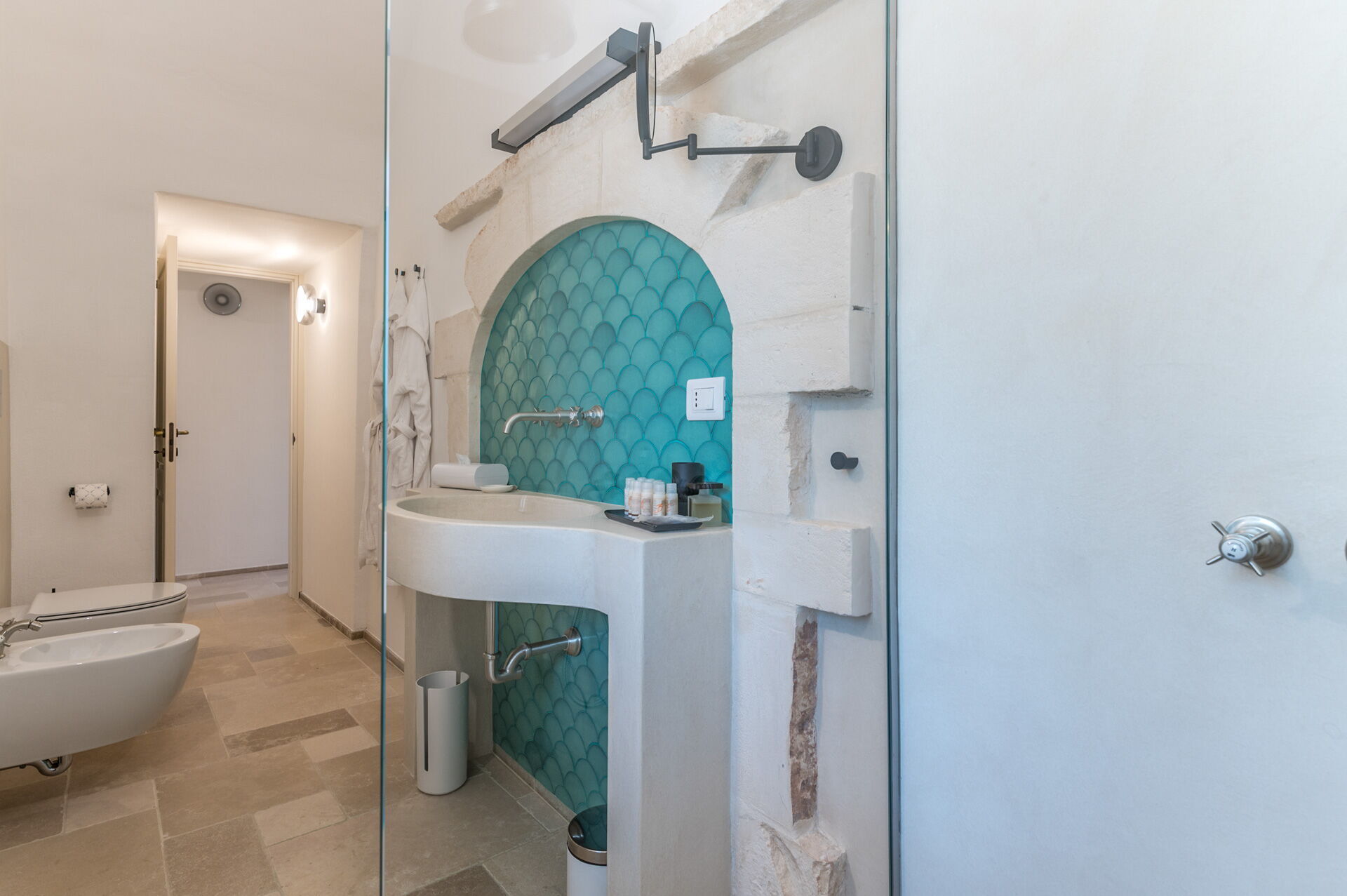 The sleeping area consists of two bedrooms with double beds that share a bathroom complete with toilet, bidet, sink, mirror and shower.