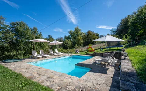 The rustic, comfortable apartment house Casa Domenica offers a shared terraced garden with plants, trees, and a seasonal swimming pool (7 x 4 m, available from May 1 to October 15). You can enjoy garden furniture, a barbecue house, and a children's playground. Your rental also includes a private small terraced garden, parking at the house, and access to the internet via WiFi. Casa Domenica is located in the countryside, 2 km from the center of Monastero Bormida, Italy.