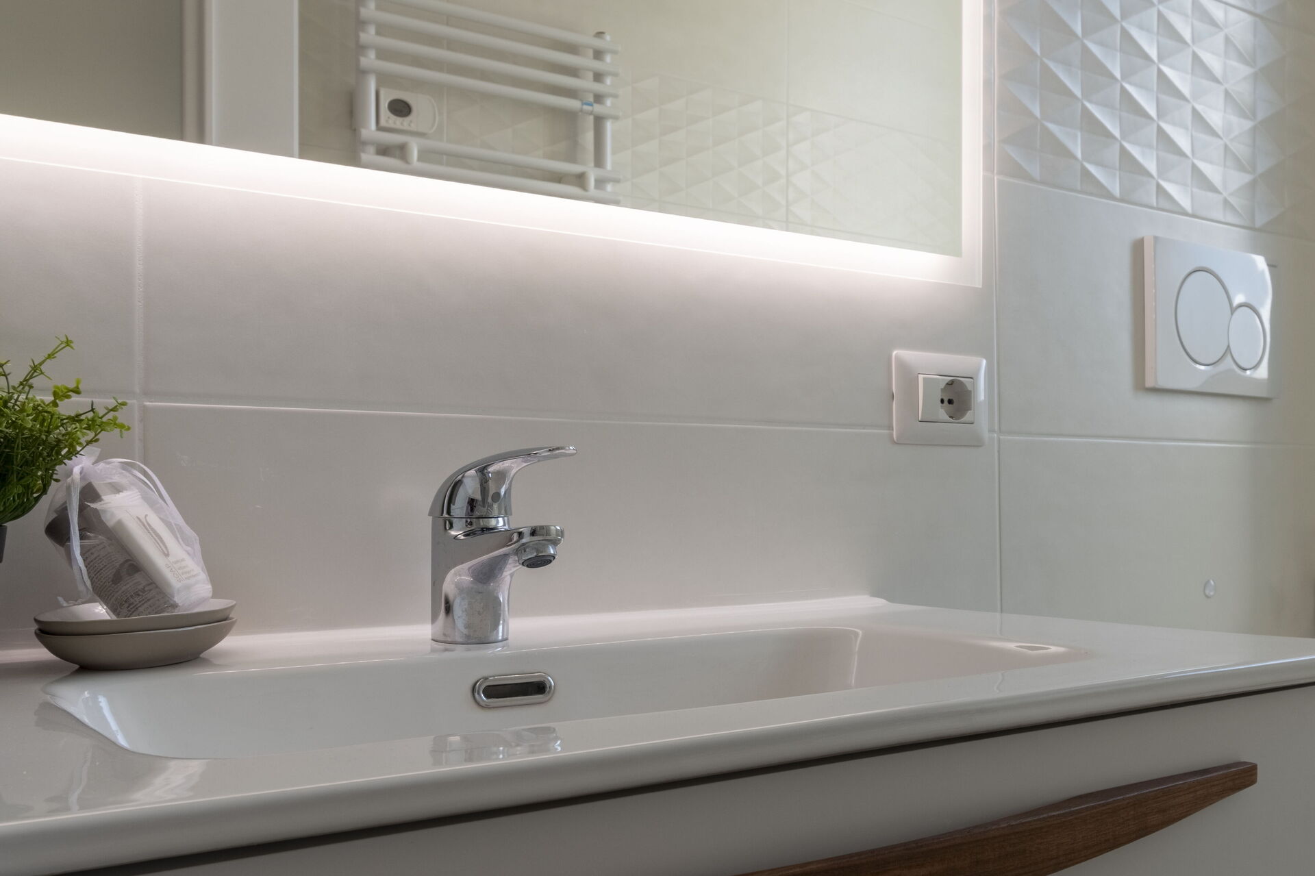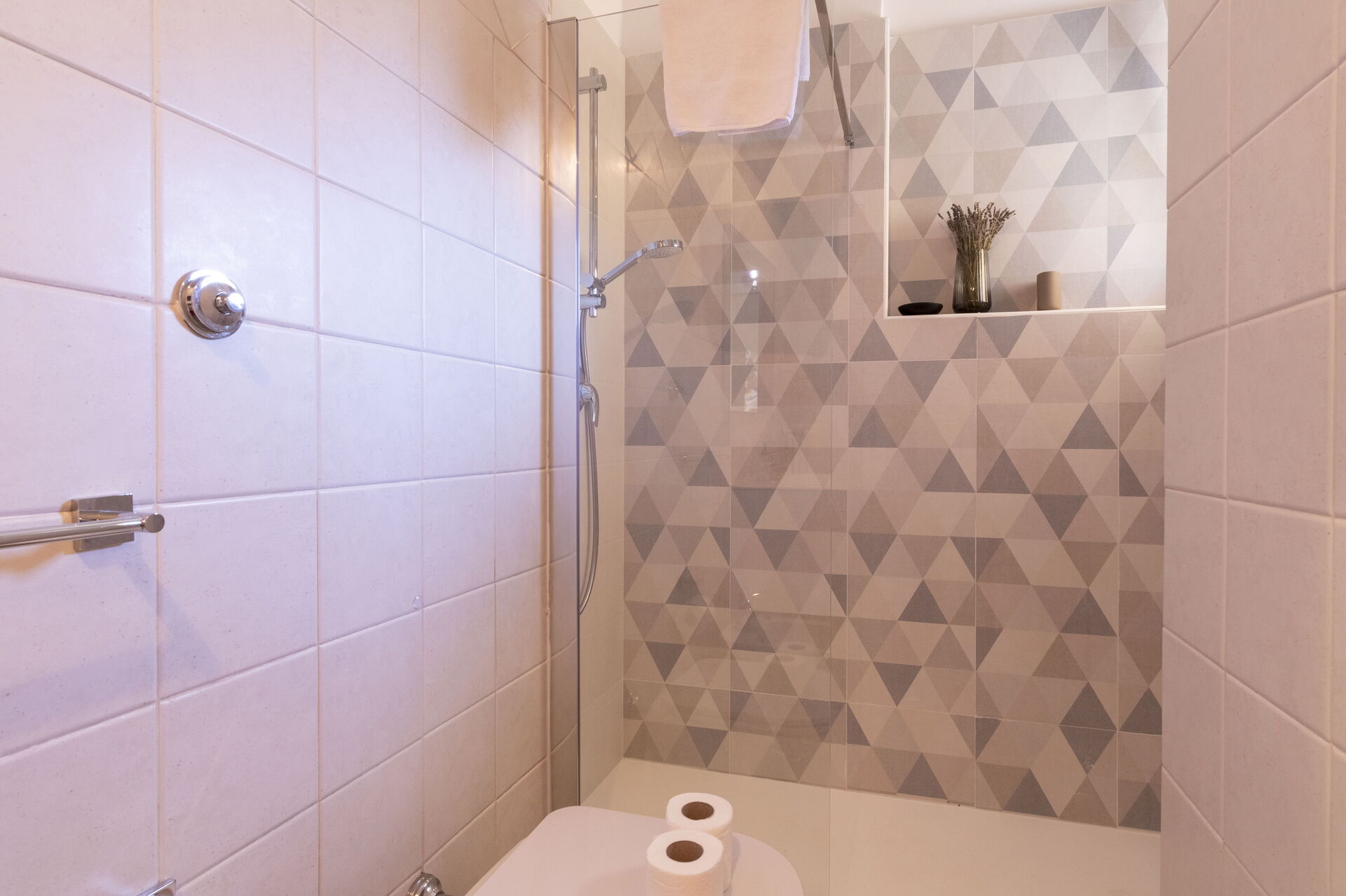 Bathroom 1: basin, toilet, shower, hairdryer.