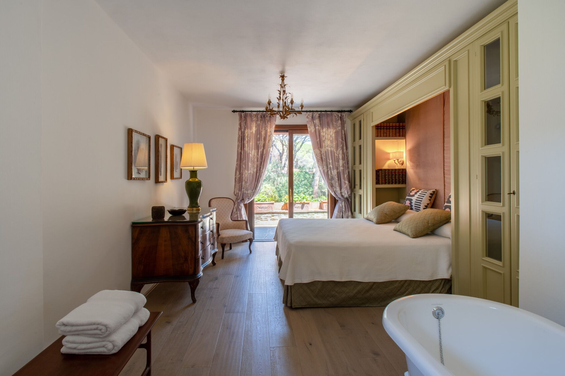 Bedroom + Ensuite Bathroom 6: king size bed, WIFI internet, air conditioning, mosquito net, armchair, working desk, basin, toilet, bidet, bathtub, shower, hairdryer, exit to the garden.