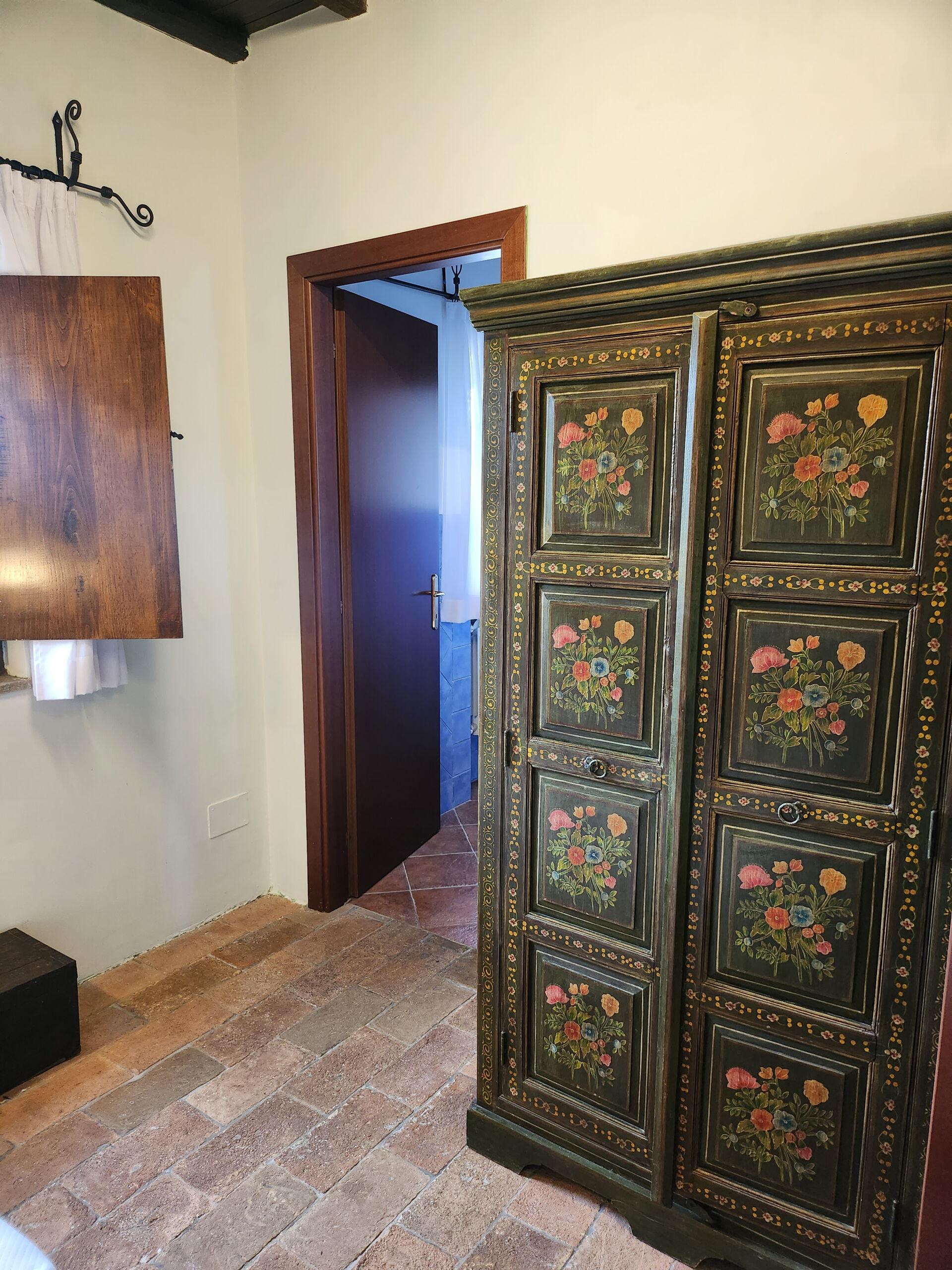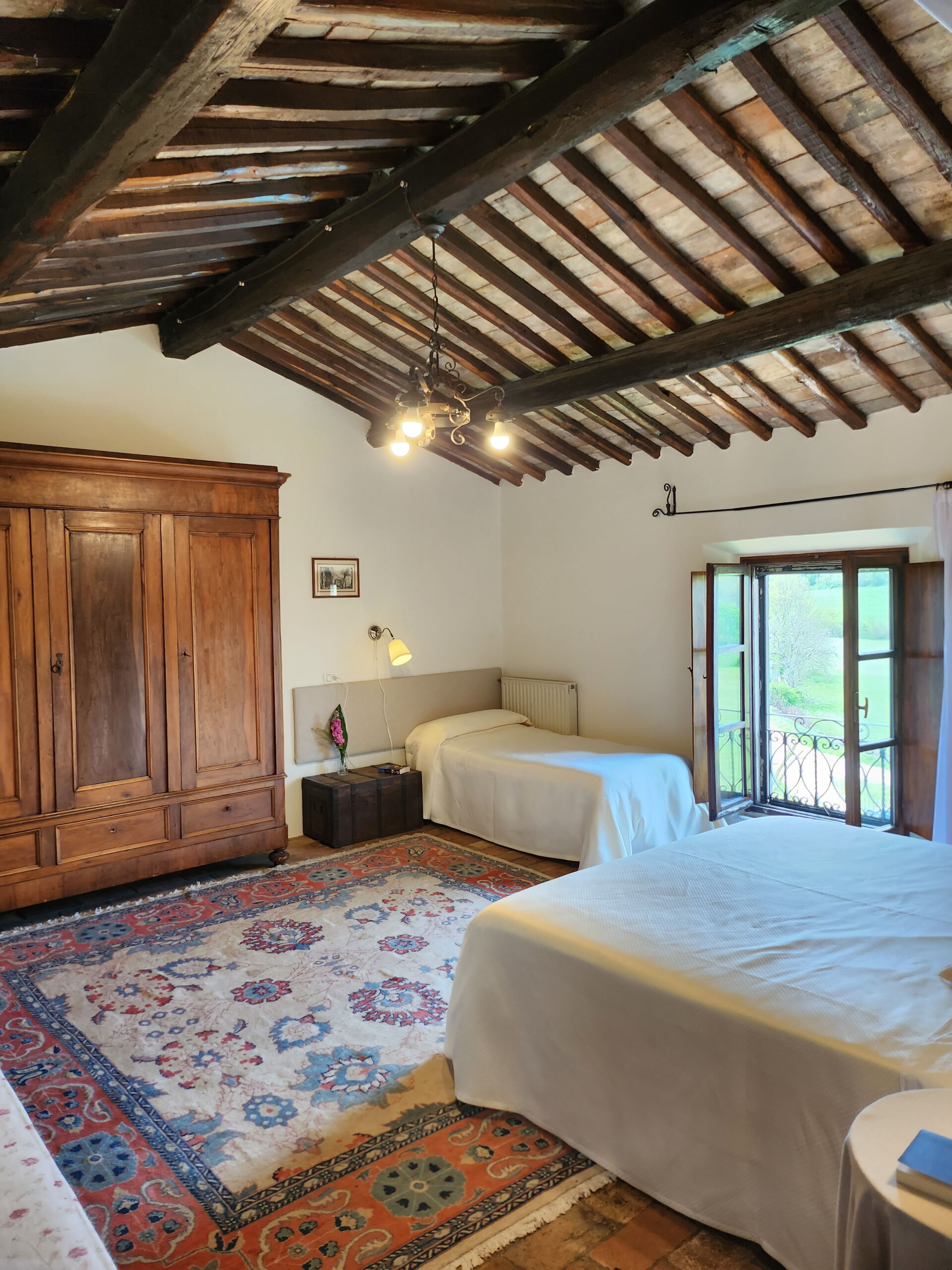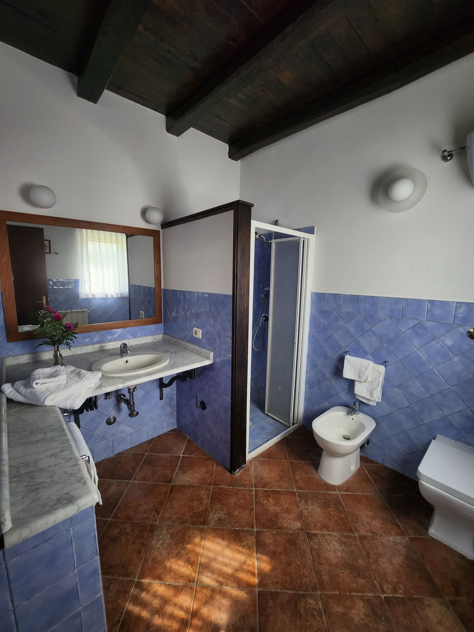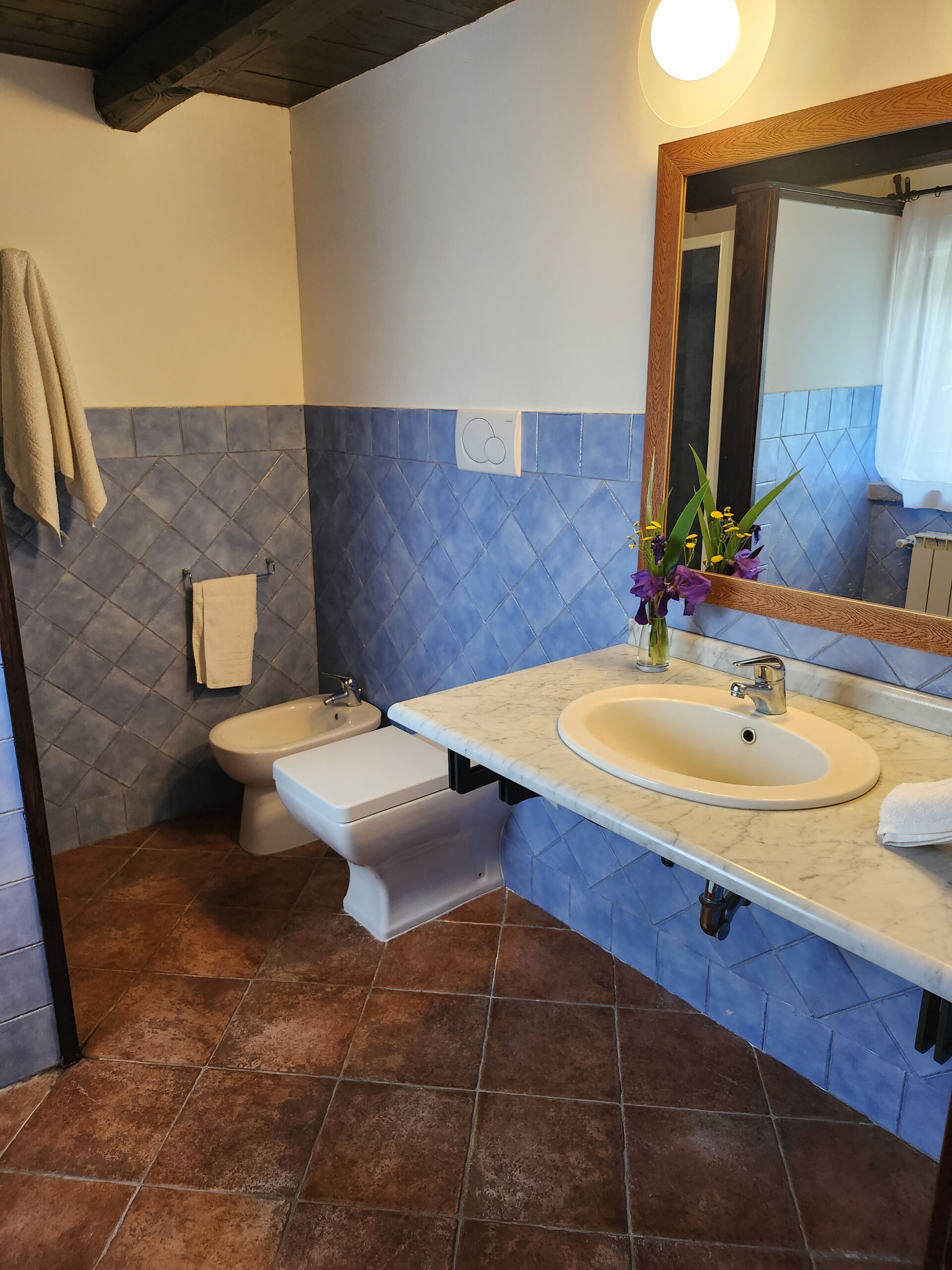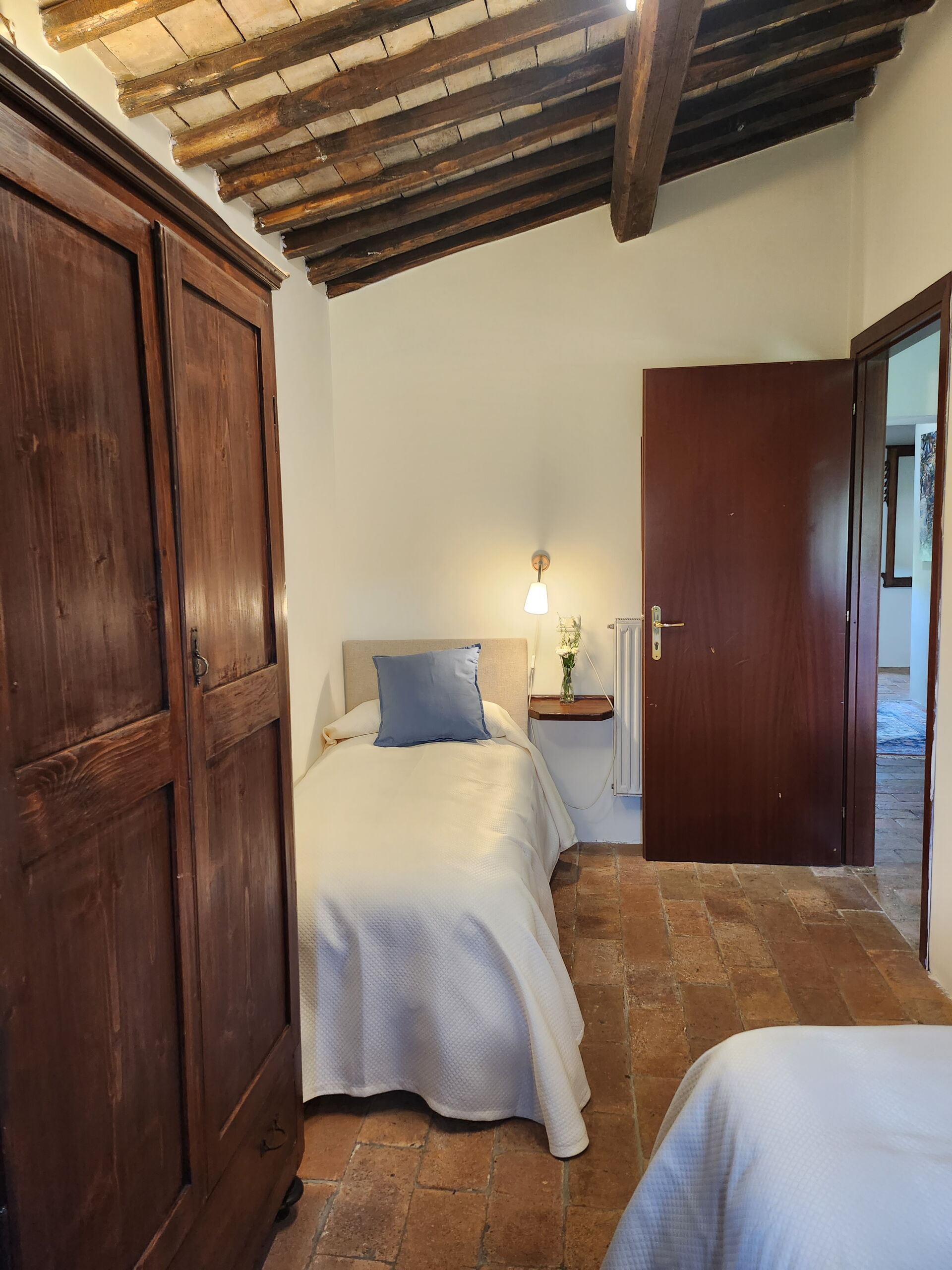 Bedroom + Ensuite Bathroom 2: double bed, two single beds, WIFI internet, armchair, basin, toilet, bidet, exit to the garden.
