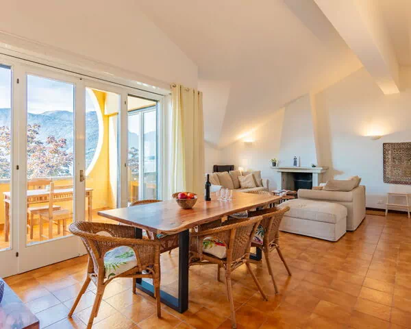 "Punta Grumo 2" is a beautifully appointed 4-room vacation rental apartment of 120 m2, situated on the first floor and designed to comfortably accommodate up to 6 guests across 3 bedrooms and 2 bathrooms. Upon entering through a private entrance, you are welcomed into a bright and inviting living and dining room featuring an open-hearth fireplace intended purely for decorative purposes, a dining table, and direct access to the balcony, where you can enjoy a very beautiful view of the lake and the mountains. The balcony is equipped with outdoor furniture, making it an ideal spot for relaxing and taking in the surroundings. The first bedroom is a double room complete with its own shower, bidet, and WC, offering added privacy and convenience. The second bedroom is also a double room, providing a comfortable and well-furnished space for guests. The third room is fitted with 2 beds, making it a versatile option for additional guests. A separate shower and WC serves the remaining bedrooms, bringing the total bathroom count to 2. The fully equipped kitchen features an oven, a dishwasher, 4 induction hot plates, a toaster, and an electric coffee machine, ensuring everything you need for self-catering is readily at hand.