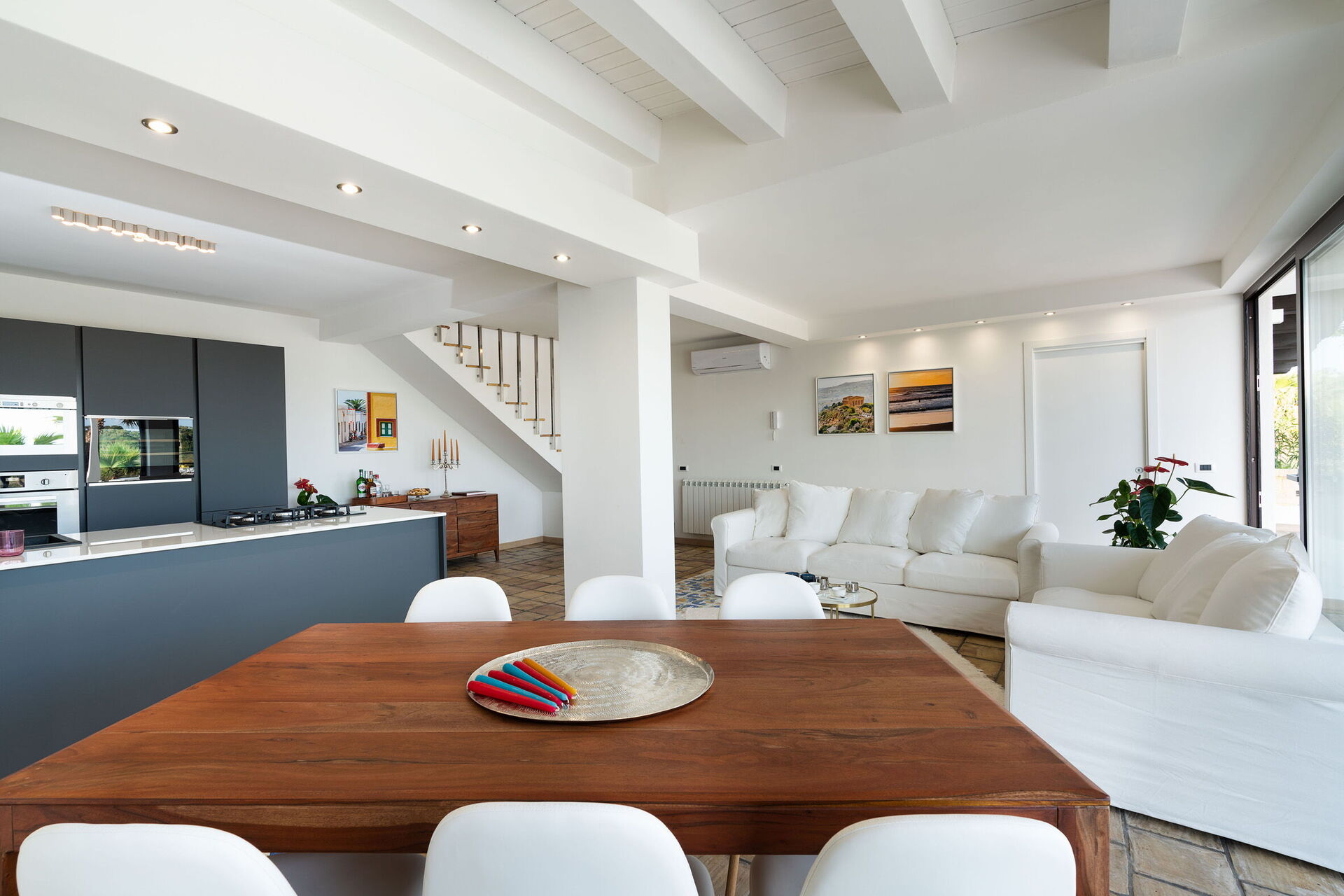 Kitchen + living room: well equipped kitchen, dining table (people: 6), dishwasher, fridge, freezer, microwave, stove top, oven, toaster, iron, italian coffee machine, american coffee machine, sofa (people: 6), WIFI internet, internet, air conditioning, highchair, satellite tv, smoke detector, co2 detector, exit to the terrace.