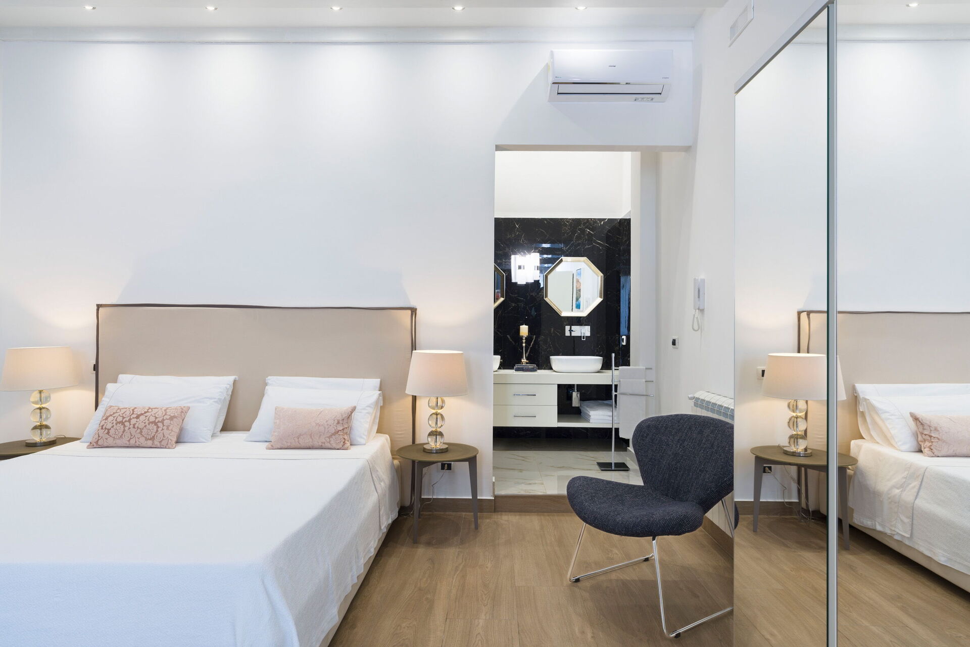 Bedroom + Ensuite Bathroom: double bed, baby crib, WIFI internet, internet, air conditioning, armchair, basin, toilet, bidet, shower.