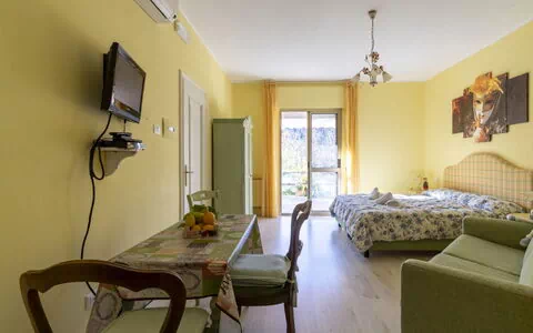 The "Valentina" is a cozy, one-room apartment spanning 30 square meters, situated on the ground floor of the property. It has undergone a tasteful renovation in 2023, ensuring a warm and inviting ambiance. The living and sleeping areas are combined into one space, featuring a double bed measuring 160 cm wide and 200 cm long, accompanied by a television. Additionally, the apartment provides direct access to a spacious terrace.