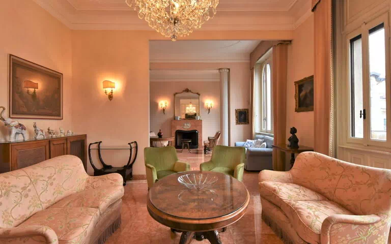 You will find that this vacation home is a spacious 7-room apartment spanning 300 square meters across two levels on the second floor. The living area is bright and features antique, tasteful furnishings, including a large 100 square meter living room with an open-hearth fireplace for decoration and a dining table. There are exits leading to balconies from the living room, dining room, one double bedroom with TV, radio, CD player, hi-fi system, and air conditioning, as well as the kitchen. The kitchen is equipped with an oven, dishwasher, four gas rings, toaster, kettle, microwave, electric coffee machine, and complimentary Nespresso capsules. On the lower ground floor, there is a large room with a bed, a sofa bed, a sleeping facility, and air conditioning, as well as a large double bedroom with a shower, bidet, WC, and air conditioning. Additionally, there is another double bedroom with access to a balcony, and a separate bath/shower/bidet/WC.
