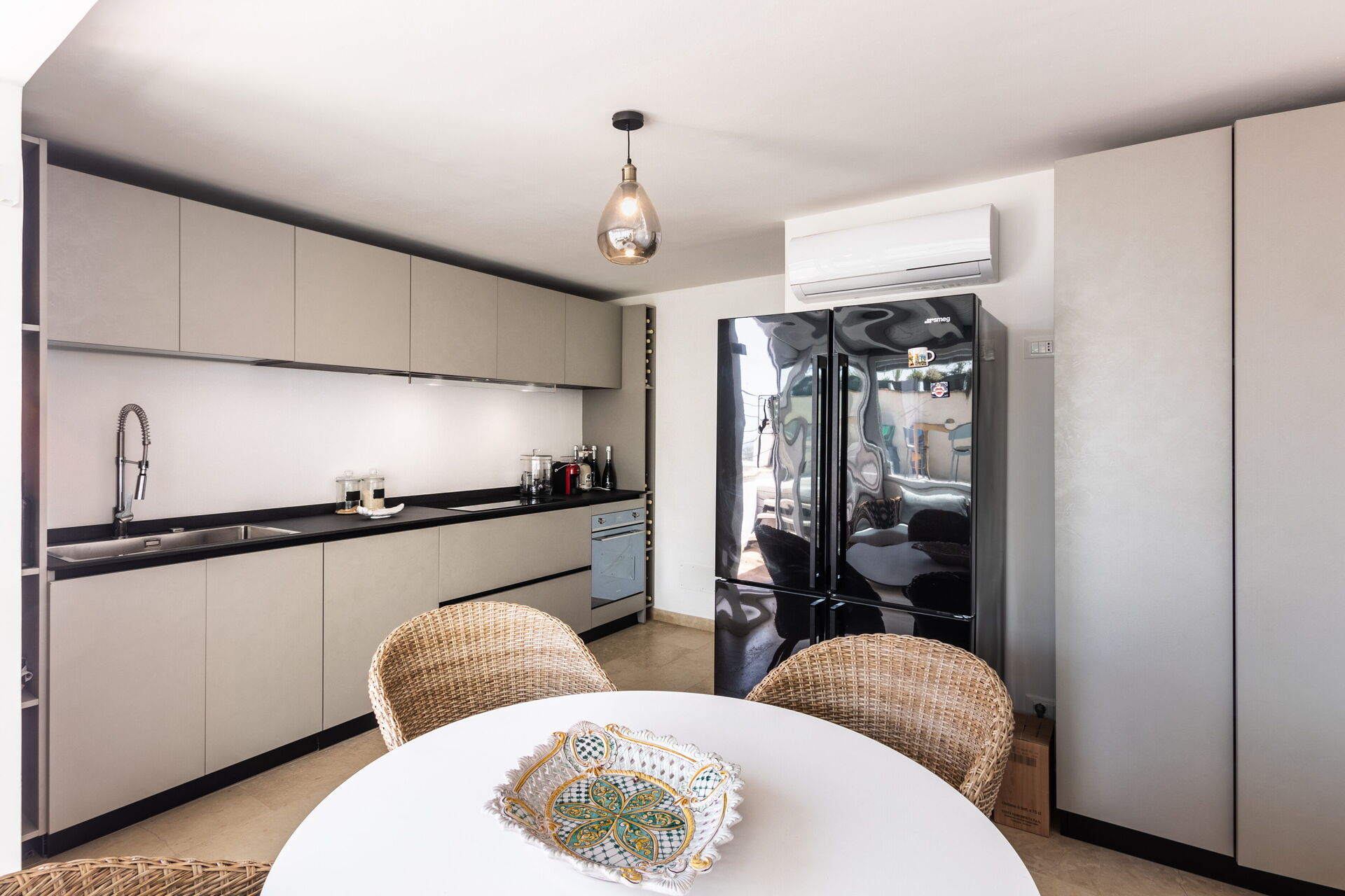 Kitchen + living room: well equipped kitchen, dining table (people: 5), dishwasher, fridge, freezer, stove top, oven, italian coffee machine, washing machine, sofa, armchair, WIFI internet, air conditioning, television, exit to the terrace.