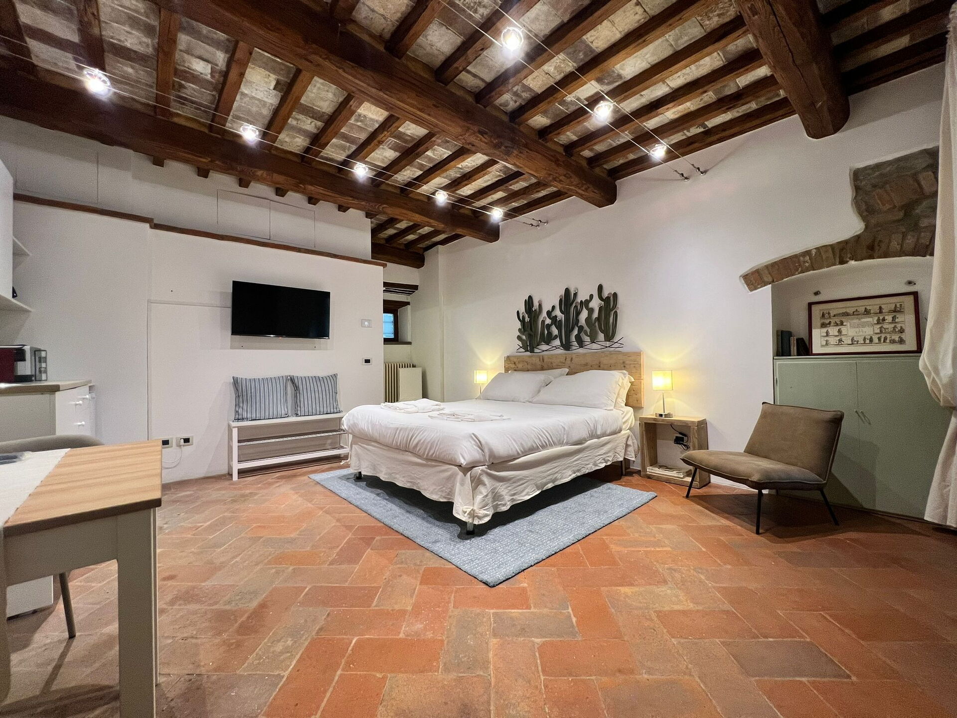 Open space: dining table (people: 2), double bed, WIFI internet, satellite tv, fridge, dishwasher, microwave, toaster, american coffee machine.