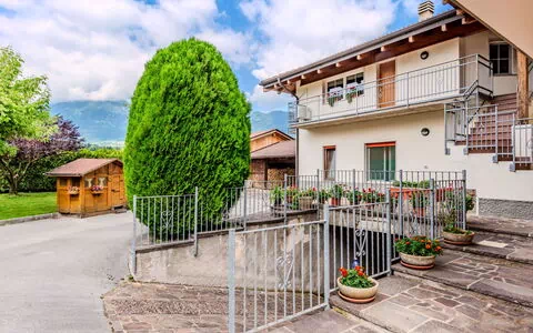 Modern, cozy 2-family house "Carli" offers a peaceful vacation rental in Comano Terme, with amenities including a yard, Internet WiFi, and parking on-site. The two-story property boasts a sunny, quiet location amidst the countryside, just 3 km from the town center.