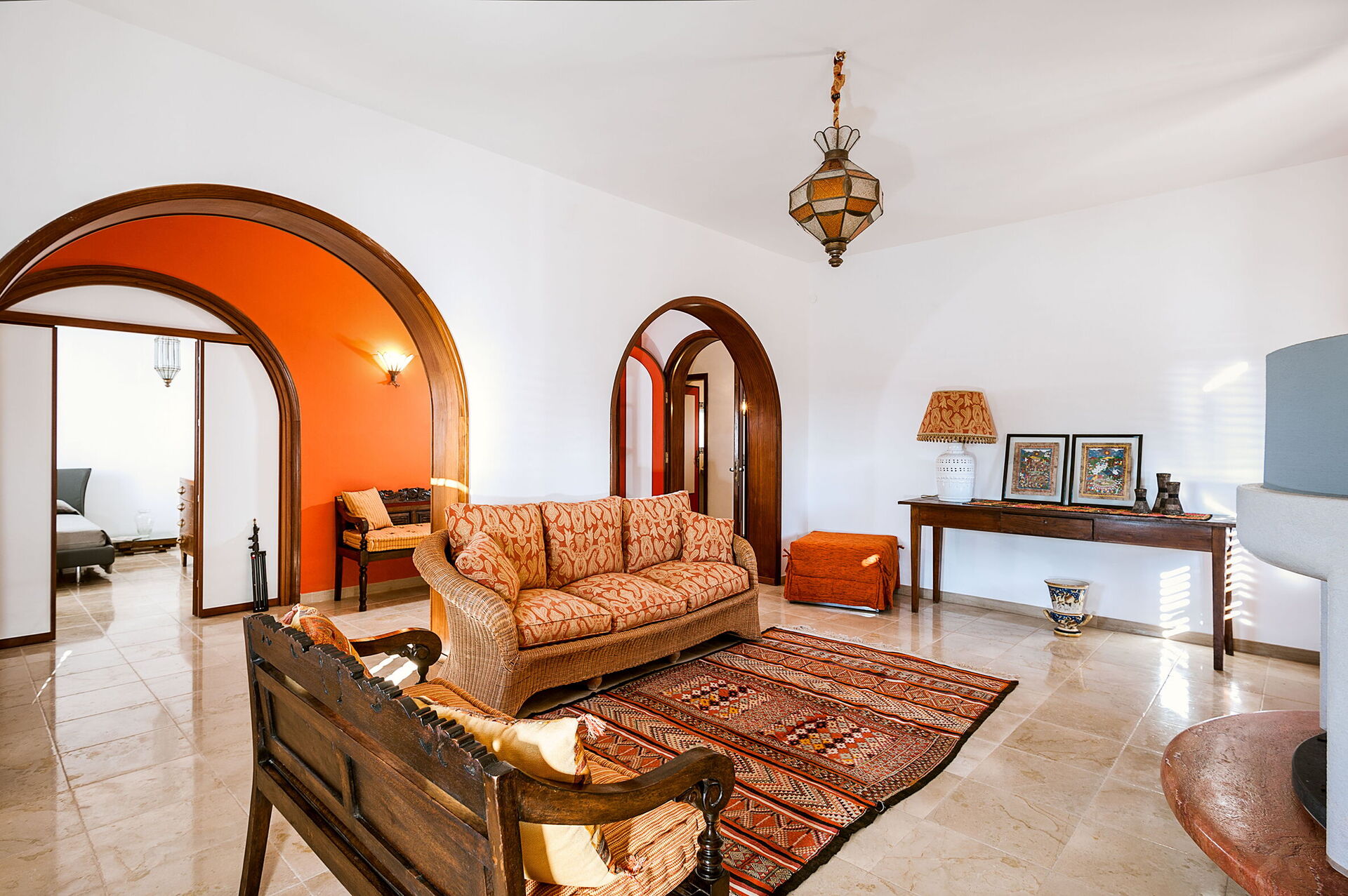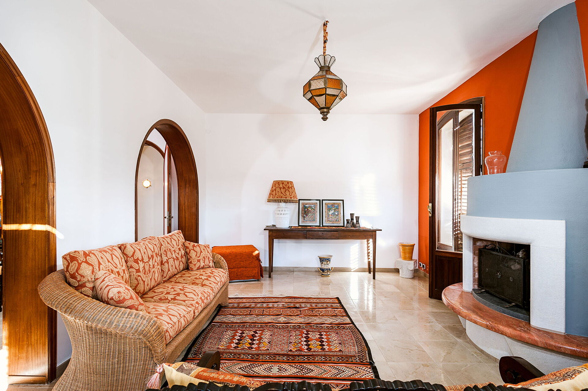 Living room: sofa, fireplace, exit to the garden, exit to the terrace.