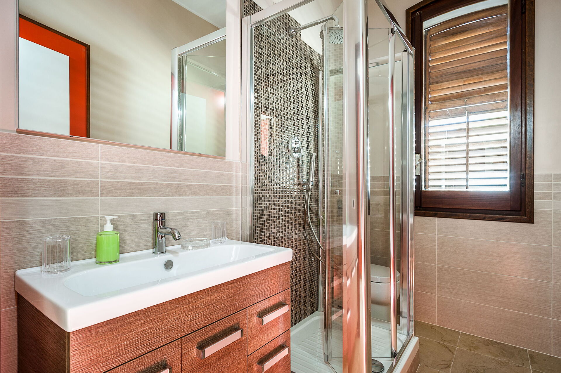 Bathroom 1: basin, toilet, bidet, shower.