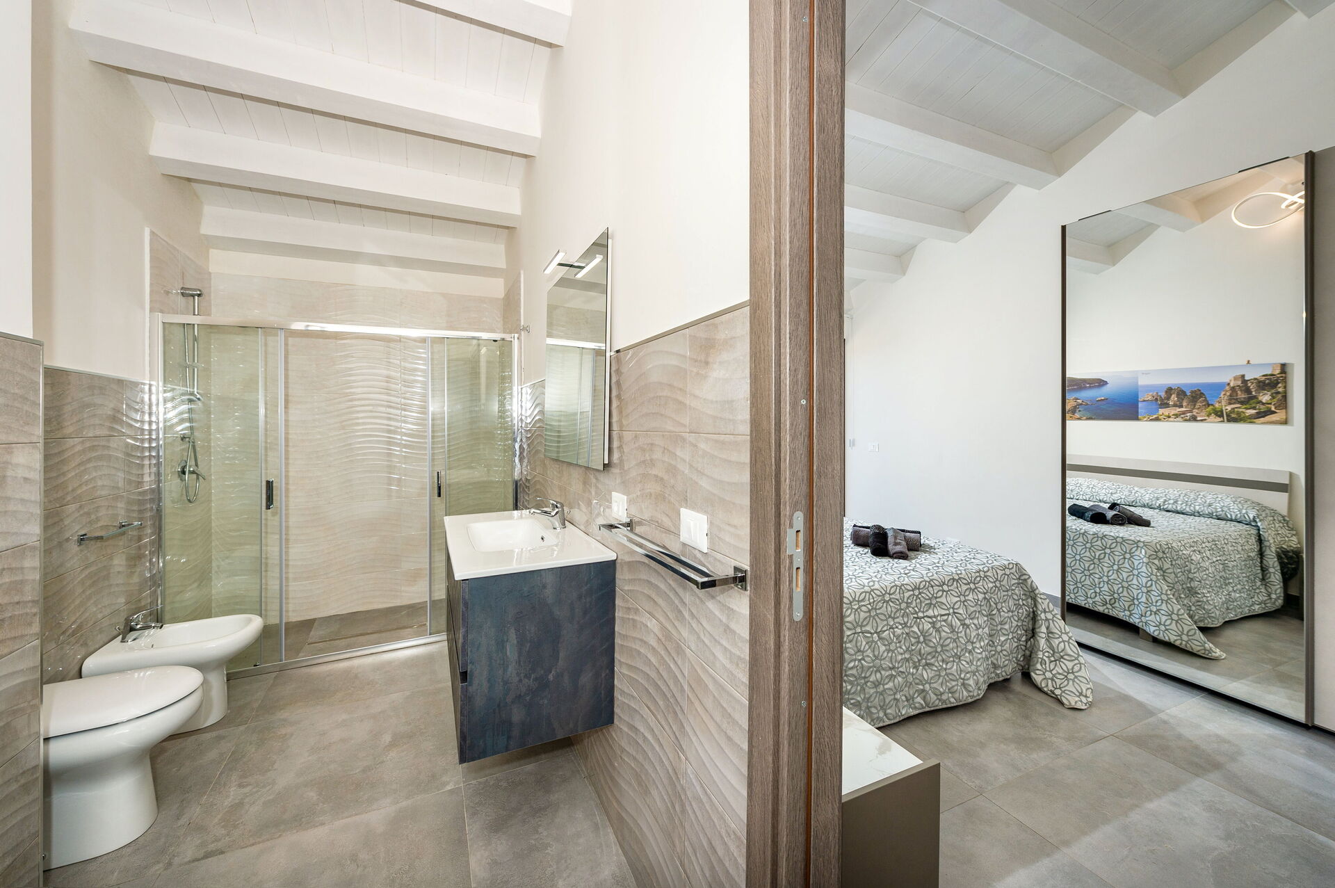 Bedroom + Ensuite Bathroom: double bed, air conditioning, basin, toilet, bidet, shower.