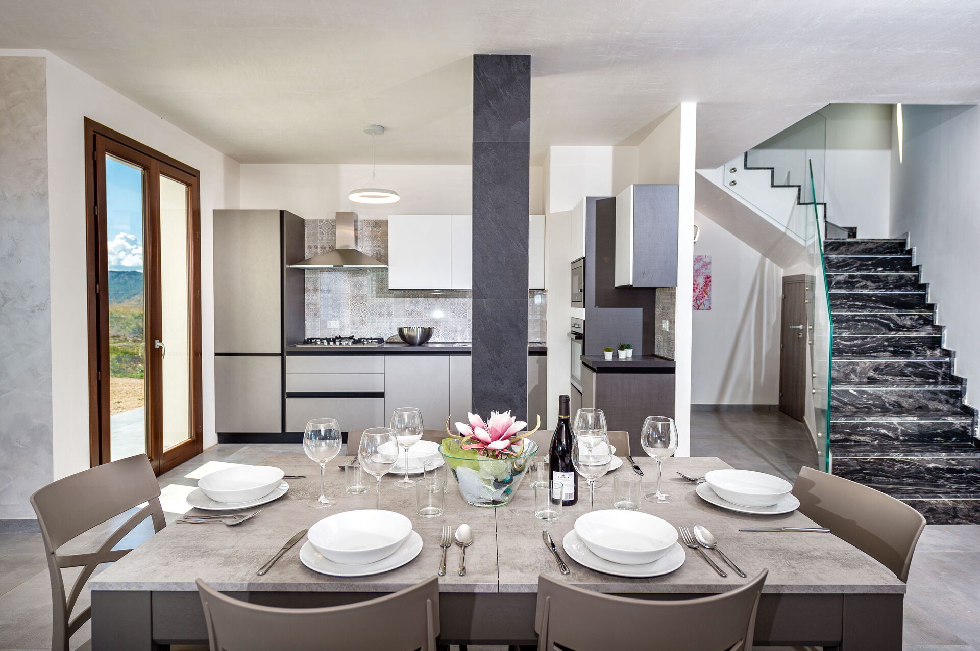 Kitchen + living room: dining table, dishwasher, fridge, freezer, microwave, stove top, oven, toaster, WIFI internet, television, exit to the veranda.