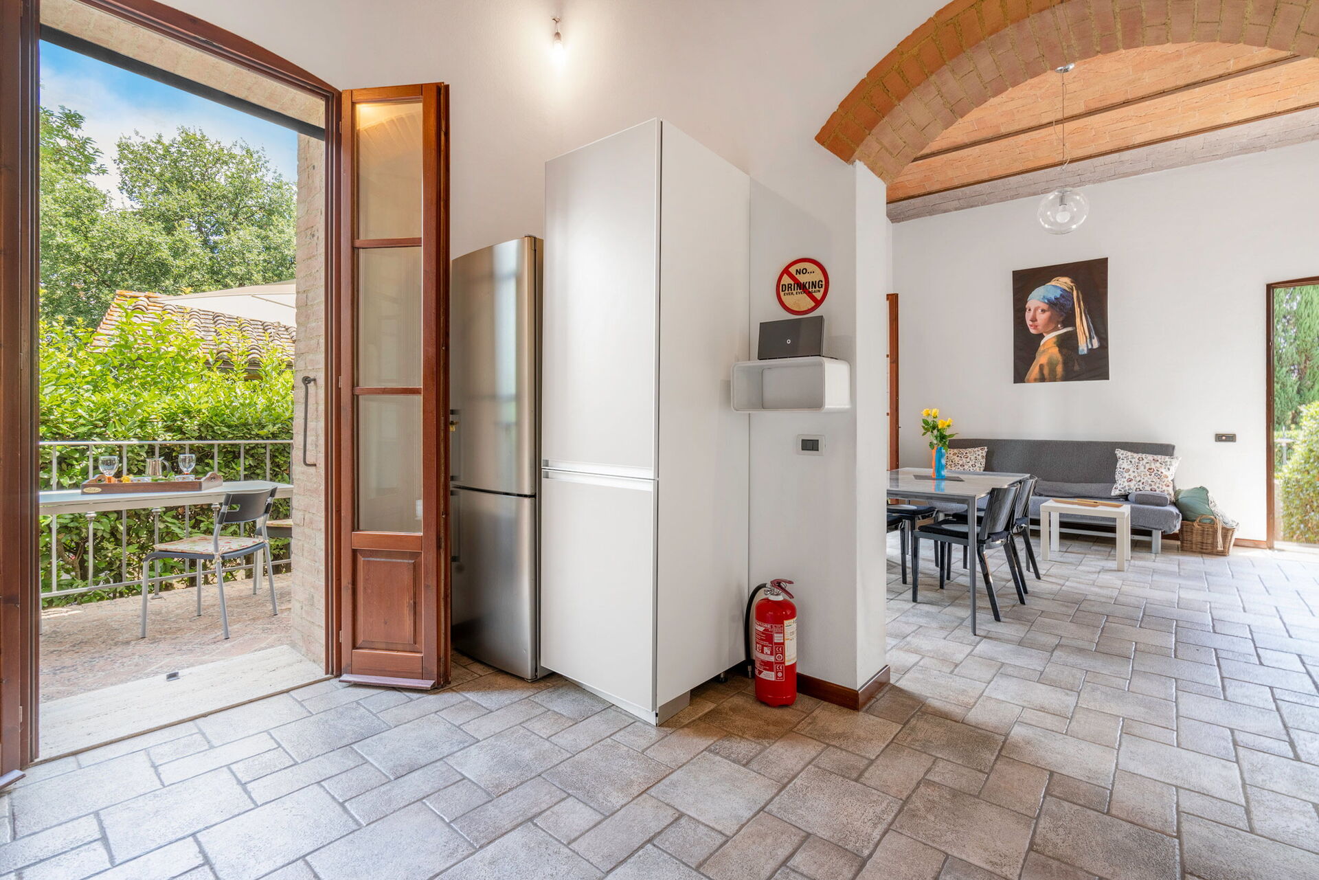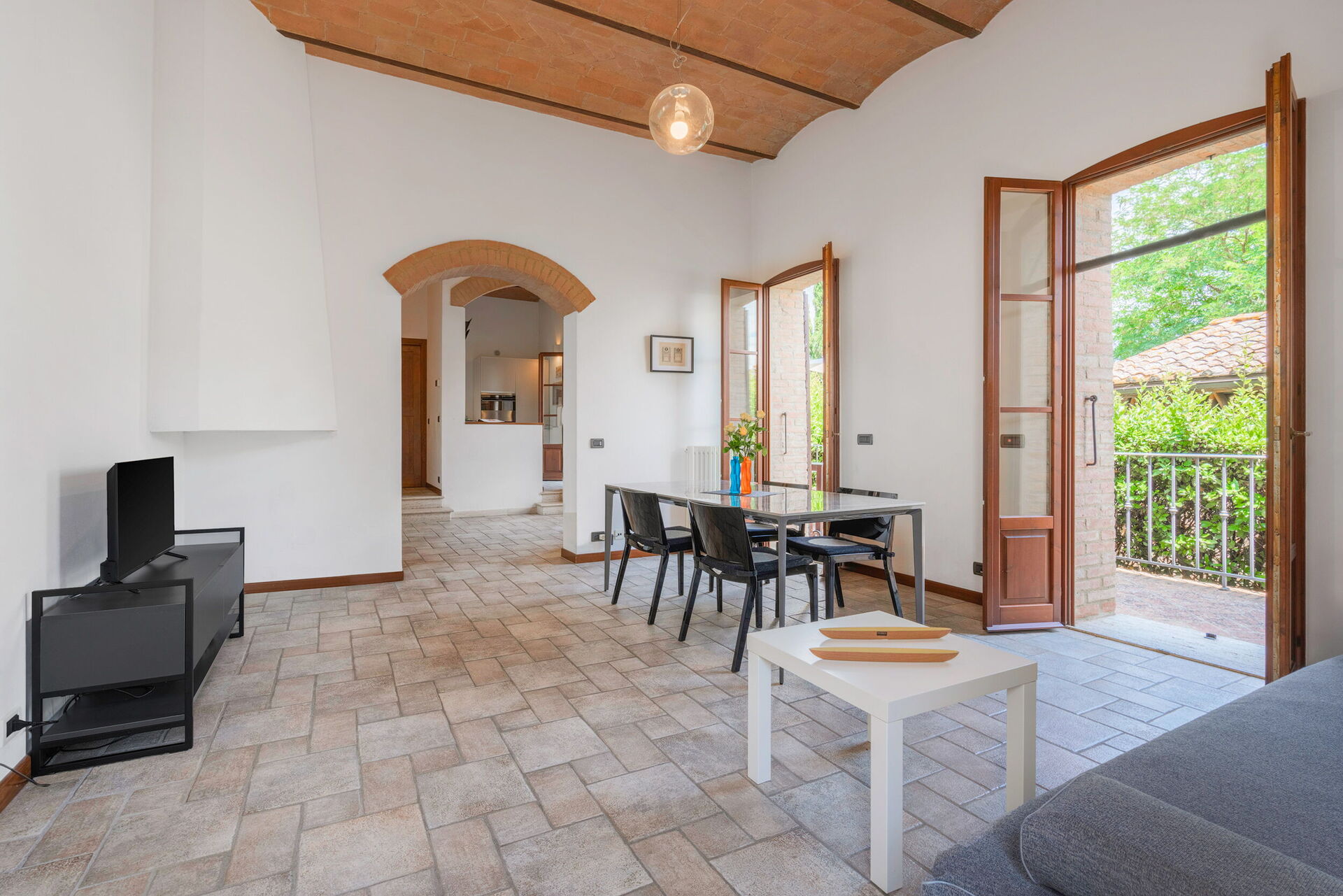 Living room: sofa (people: 3), dining table (people: 4), television, exit to the garden.