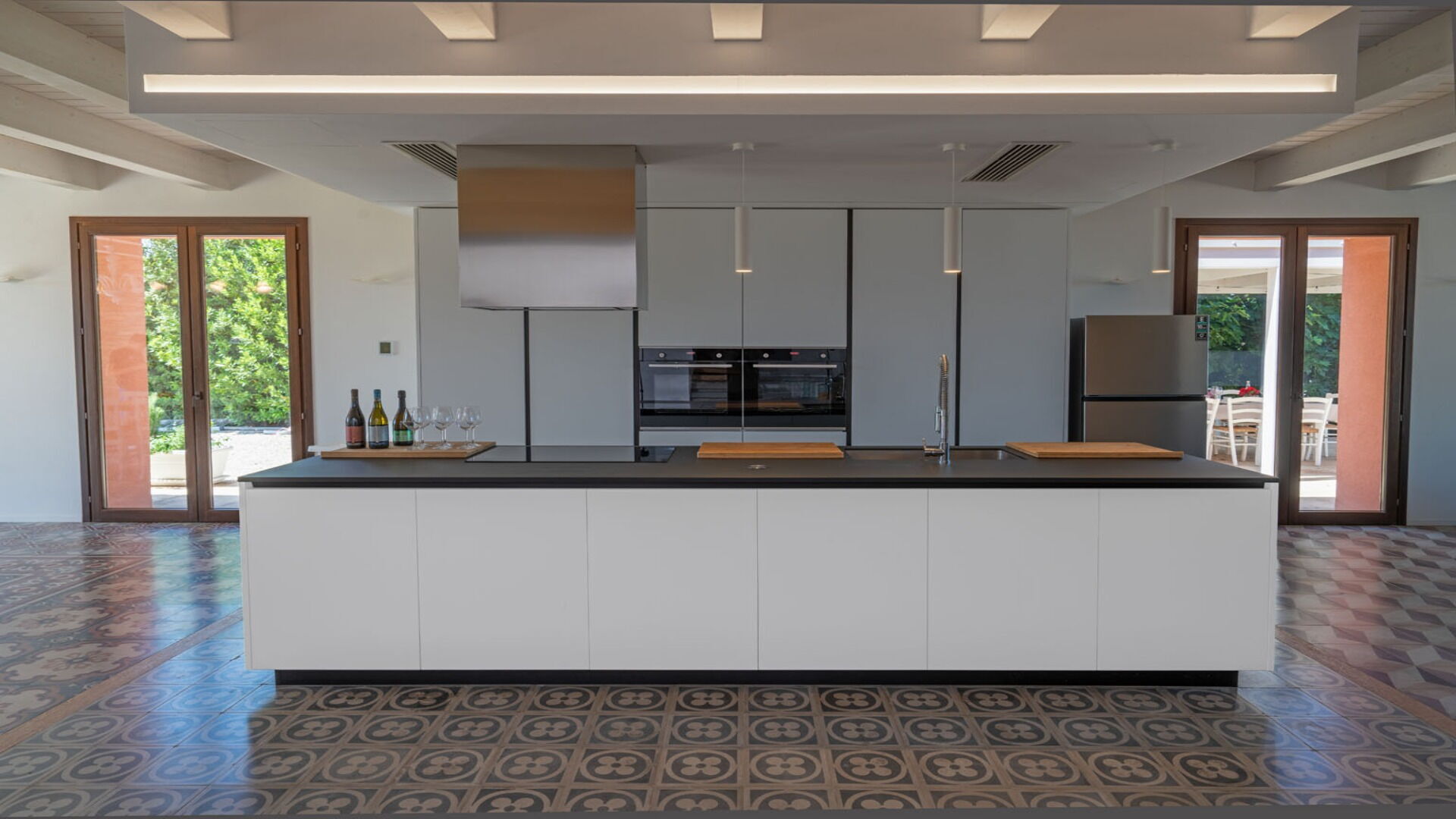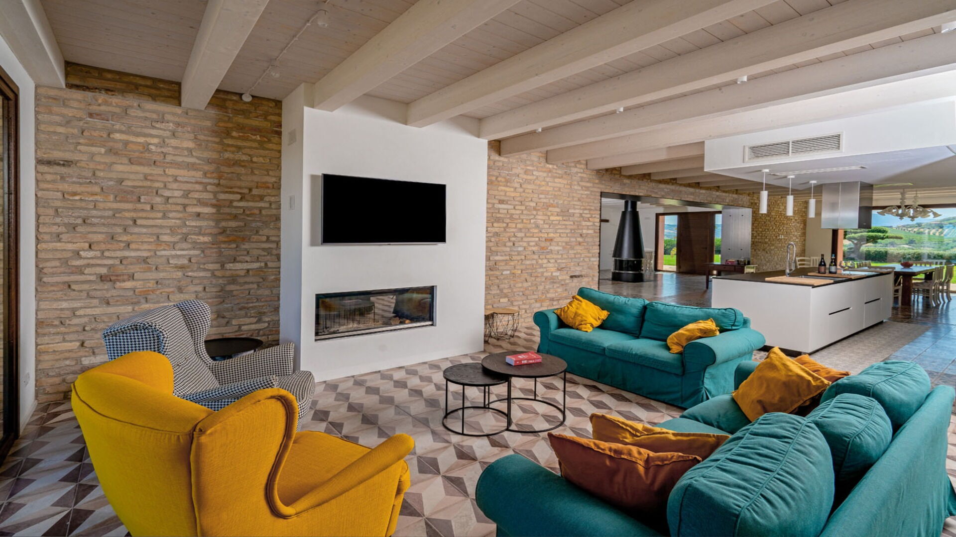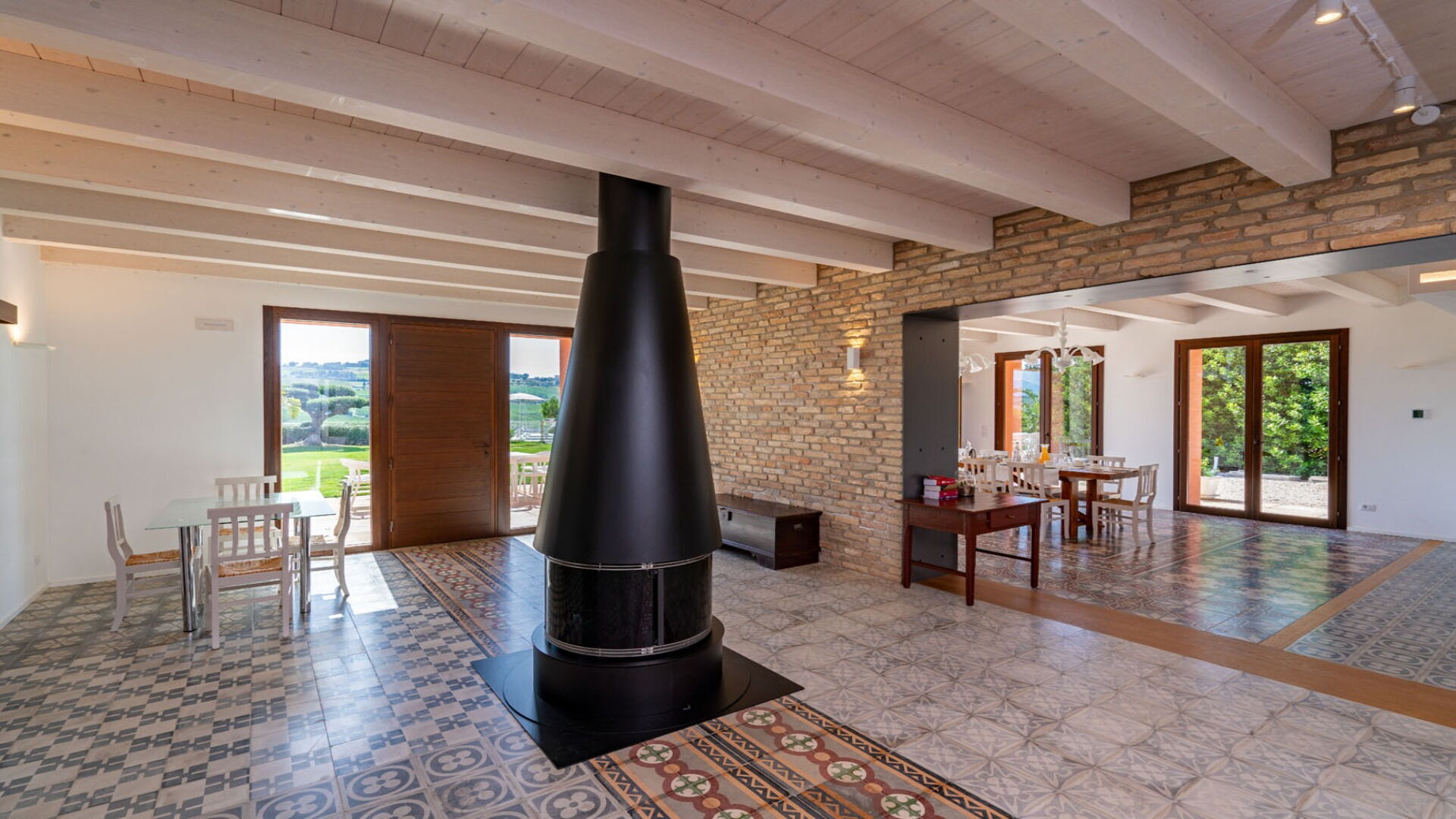 Kitchen + living room: well equipped kitchen, dining table, dishwasher, fridge, freezer, stove top, oven, iron, italian coffee machine, sofa, armchair, working desk, fireplace, WIFI internet, internet, air conditioning, television, exit to the balcony, exit to the garden, exit to the patio, exit to the terrace, exit to the veranda.