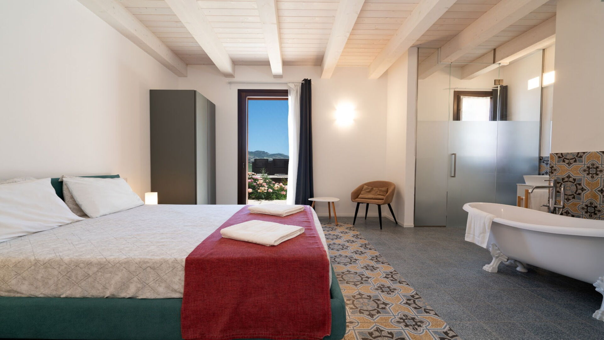 Bedroom + Ensuite Bathroom 1: double bed, basin, toilet, bidet, bathtub.