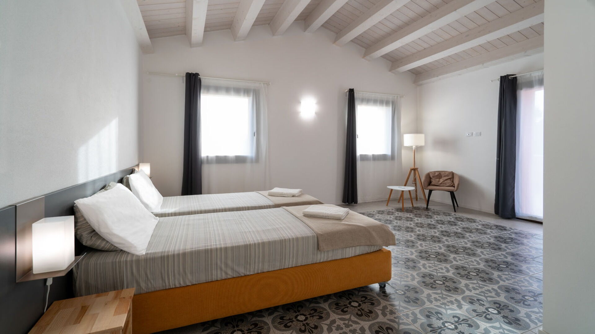 Bedroom + Ensuite Bathroom 4: double bed, two single beds, basin, toilet, bidet, shower, hairdryer.