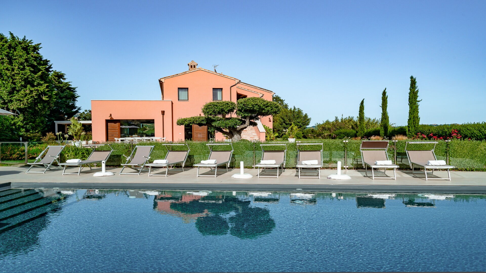 Conveniently located 5 km (3 mi) from Cossignano, Italy and only 27 km (17 mi) from Ascoli Piceno. Relais Tenuta Santori is a beautiful holiday rental (350 sq m) with WiFi internet, air conditioning and private pool. The property can accommodate up to 14 people comfortably in six bedrooms with seven bathrooms.