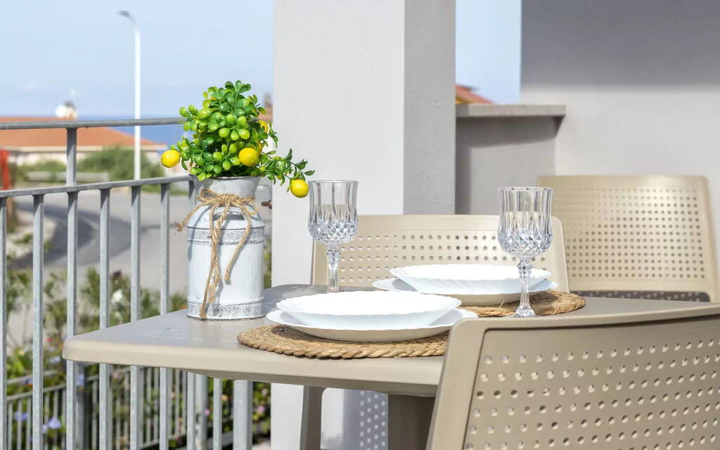 The apartment is furnished with modern and stylish furnishings. It offers air-conditioning and forced-air heating for your comfort during your vacation. Outside, there is a small terrace that is partially roofed, providing a sitting area with terrace furniture. The apartment also offers a partial view of the sea. Other amenities include a washing machine, iron, hair dryer, and free WiFi internet access.
