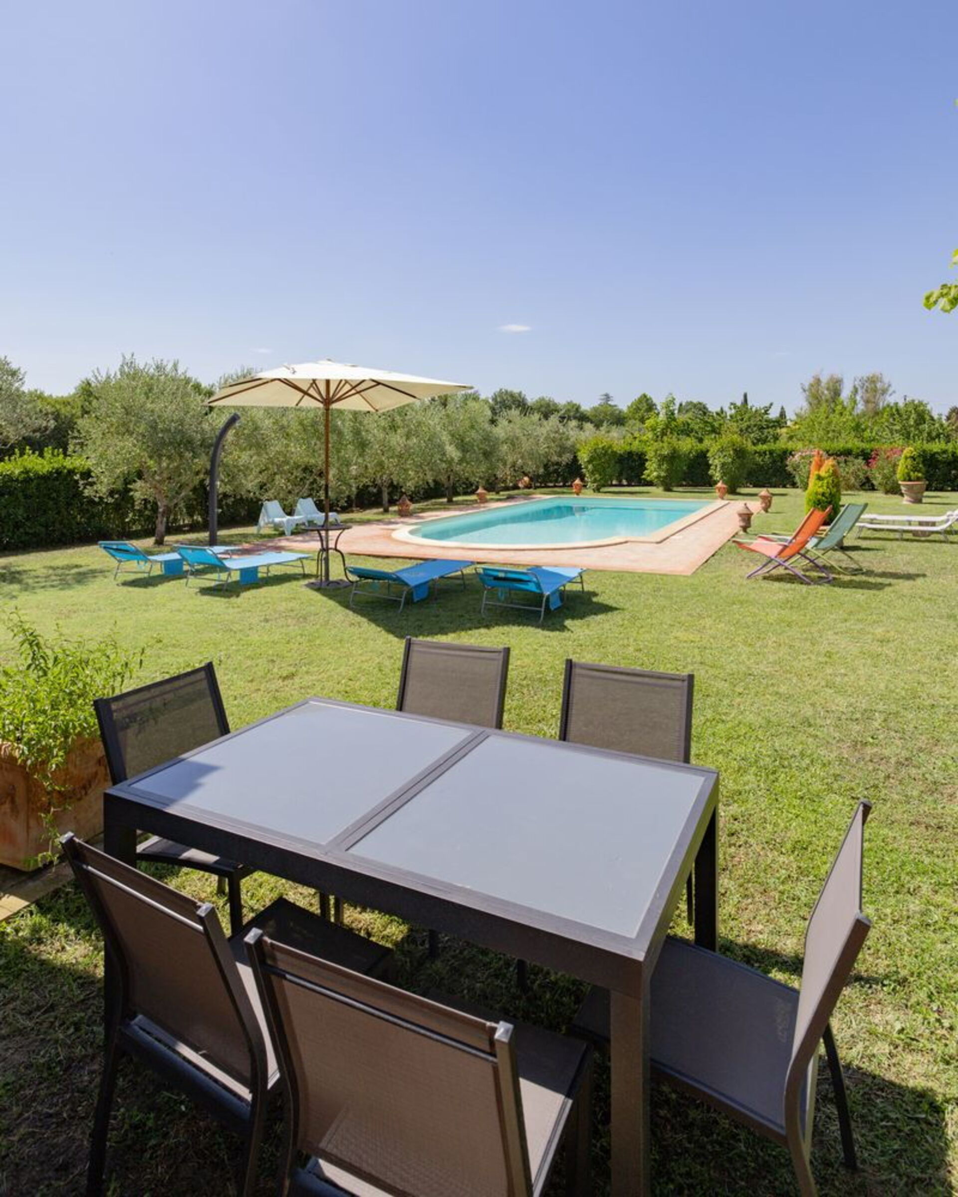 Garden: swimming pool (private, length: 8m, width: 4m, depth: 2m, outdoor, fenced), shower, shower, barbecue, al fresco dining, dining table, gazebo, garden furniture, sunbed, enclosed property.