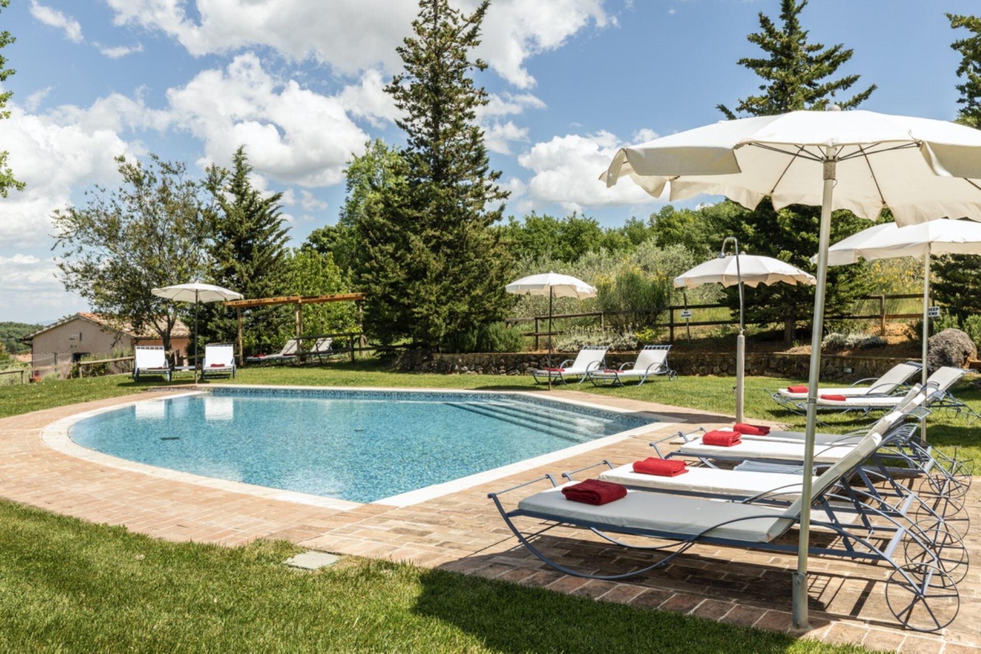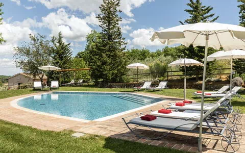 The property features a private non-heated swimming pool measuring 8 by 16 meters with a depth of 1.4 meters, available for your enjoyment from May 15 to September 30. You will discover a natural pond within the expansive garden, which is beautifully bordered by woods and olive groves, creating a serene environment for outdoor relaxation. A gazebo equipped with tables and chairs is positioned directly in front of the kitchen, offering an ideal space for al fresco dining while taking in the picturesque Tuscan landscape. Pool towels are provided for your convenience, and the entire property is fenced, ensuring privacy and security during your stay.