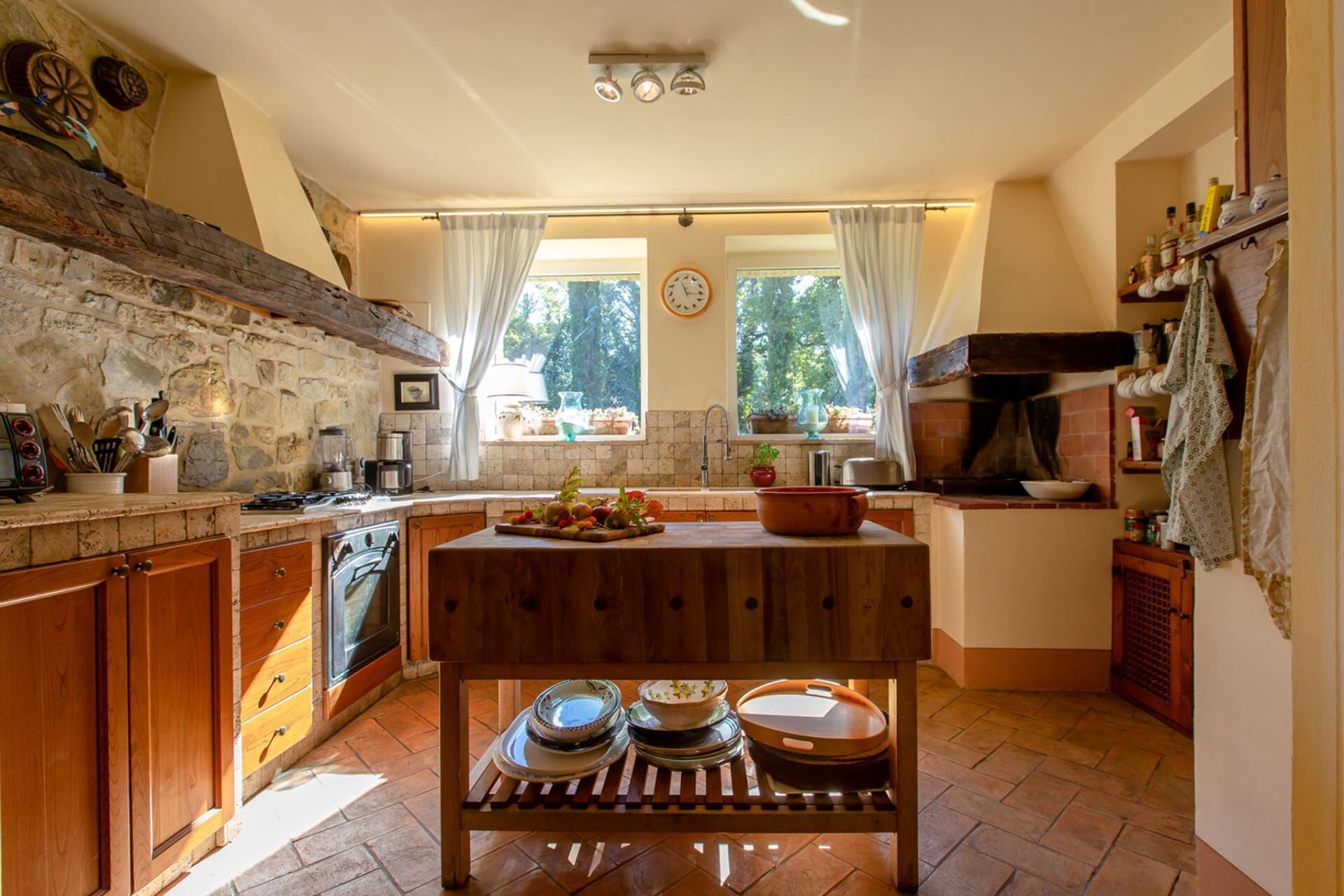 The villa is equipped with air conditioning in all five bedrooms to ensure comfortable rest during warm summer months. Entertainment options include satellite TV, a television, a VCR, and a stereo system with an iPod docking station for your enjoyment. The fully equipped kitchen features a dishwasher, stove, oven, microwave oven, American coffee maker, refrigerator, freezer, toaster, and a traditional wood burning oven for authentic Tuscan cooking experiences. A dedicated laundry room houses a washing machine for your convenience. The outdoor barbecue area includes a built-in grill perfect for preparing Mediterranean feasts. The traditional fireplaces located in both the living room and kitchen add rustic charm and authentic Tuscan character to the villa, with the kitchen fireplace available for use.