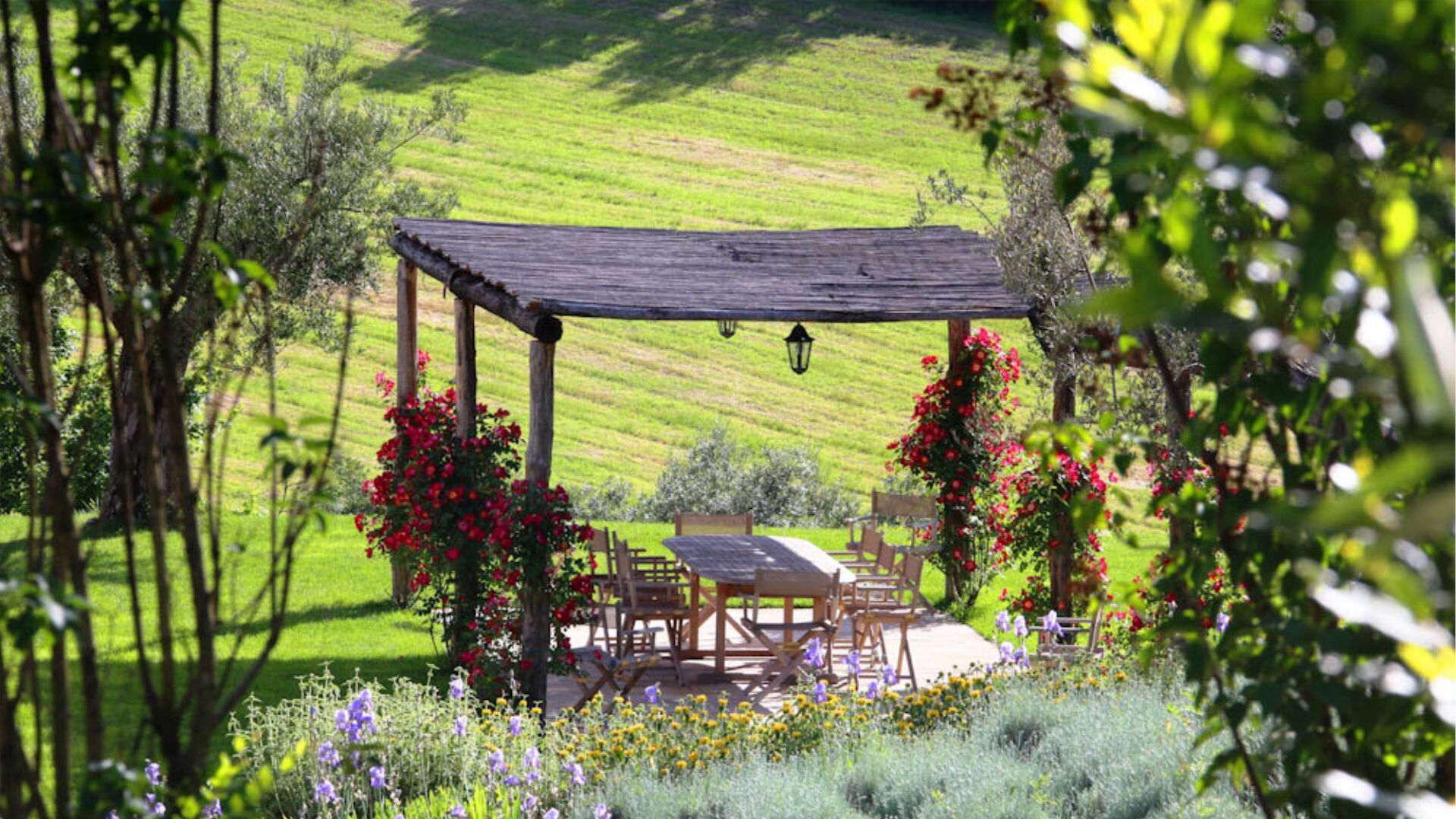The outdoor spaces of Villa del Cammino offer an extraordinary setting for relaxation and entertainment. The private heated swimming pool measures 7m x 15m with a depth of 1.5m, featuring elegant mosaic finishes and convenient steps for easy access. A protective cover is available for your convenience. The expansive landscaped garden spans 10,000 square meters, providing ample space for outdoor activities and peaceful strolls among the diverse plant life. You will find comfortable sunbeds, chairs and umbrellas arranged around the pool area for sunbathing and leisure. A panoramic pergola extends from the cottage, furnished with a dining table that seats 12 guests, perfect for al fresco meals while enjoying the stunning views. An additional wooden outdoor table positioned in front of the kitchen accommodates 8 people. The main villa living room opens onto a terrace area with armchairs and an outdoor sofa with umbrella, while a cocktail table with two armchairs sits in front of the cottage living room. A barbecue facility is available for outdoor cooking, and ping pong can be provided upon request for recreational enjoyment.