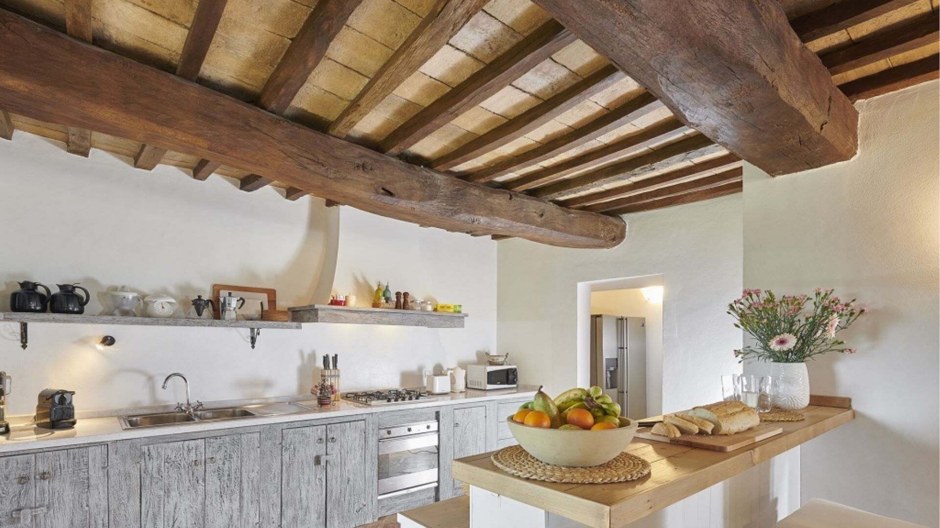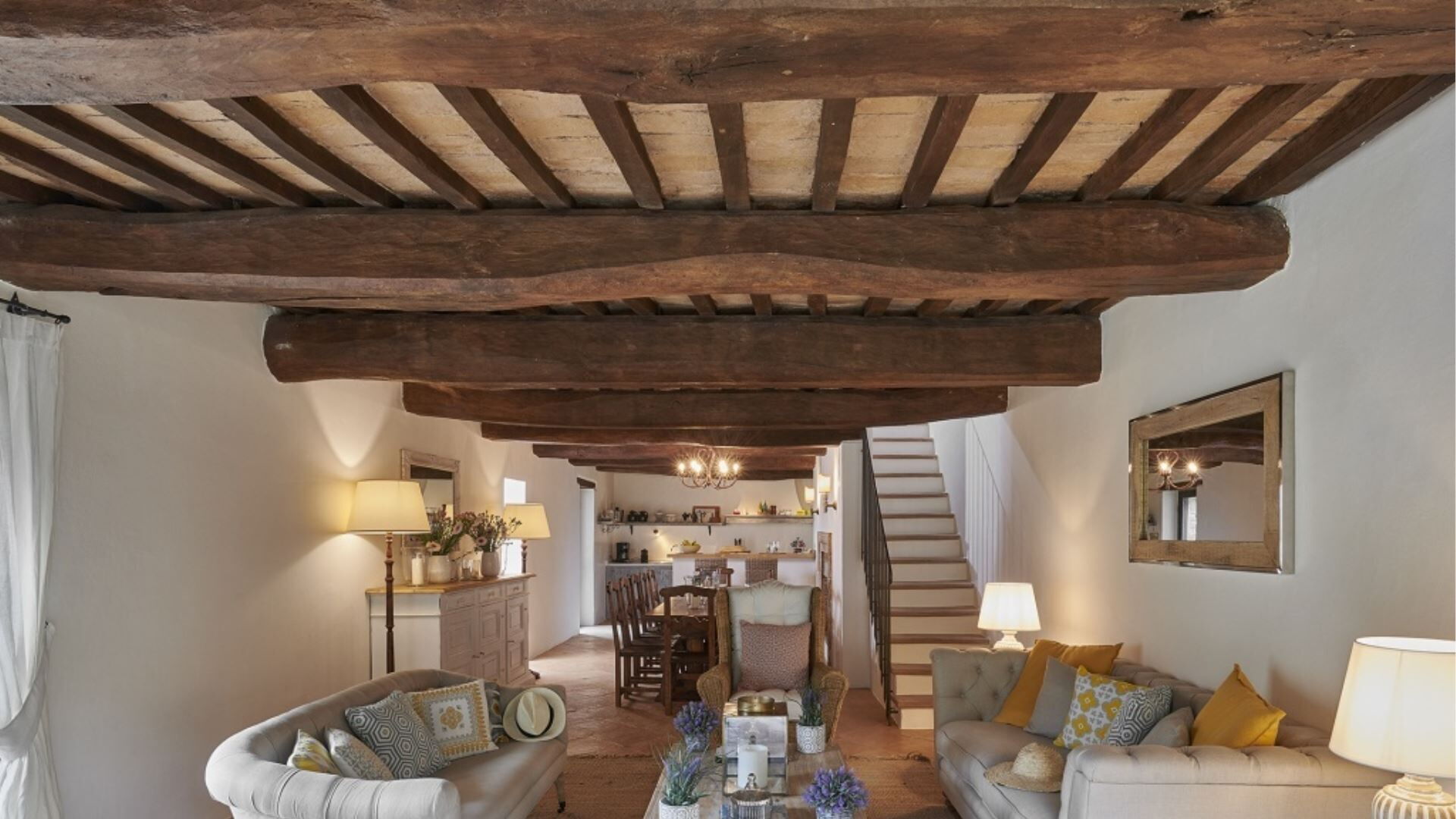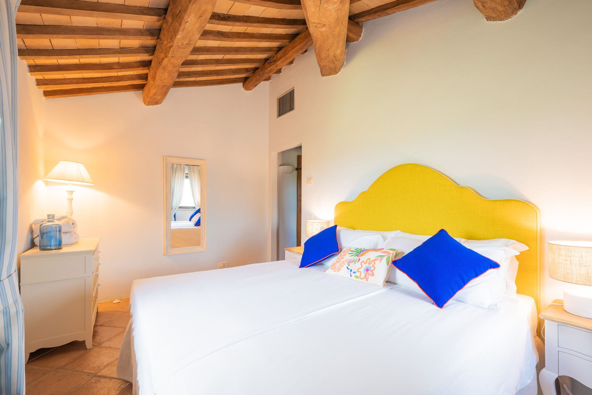 Villa Sibilla accommodates a maximum capacity of 16 guests, distributed between the main villa and the Olivo apartment, with a total of 8 bedrooms and 7 bathrooms throughout the property. The main villa spans two floors, with the ground floor featuring a welcoming living room with fireplace, an open plan living-dining room-kitchen area, a bathroom and a laundry room. The first floor is accessed via two separate staircases, creating two distinct sleeping wings. From the first staircase, you reach a king-size double bedroom measuring 2 meters by 1.90 meters with an en-suite bathroom featuring both shower and bathtub, a double room with beds measuring 0.85 meters by 1.90 meters, and another double room of the same dimensions with an en-suite bathroom with shower. The second staircase leads to a king-size double bedroom measuring 1.85 meters by 1.90 meters with an en-suite bathroom equipped with both bath and shower, a twin bedroom with beds measuring 0.85 meters by 1.90 meters, and an additional king-size double bedroom measuring 2 meters by 1.90 meters with an en-suite bathroom with shower. The independent Olivo apartment comprises a living room, a fully equipped kitchen with dining table, and two double bedrooms each measuring 2 meters by 1.90 meters, both with en-suite bathrooms featuring showers.