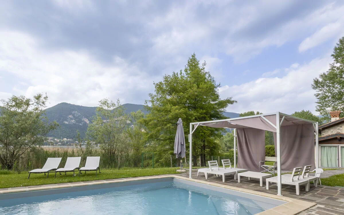 Villa "La Casetta sul Lago" is a modern, beautiful two-story detached villa surrounded by meadows in the hamlet of Clusane, 6 km from Iseo, Italy. It boasts a large fenced garden of 800 m2 with a lawn, wildlife garden, sunbathing area, and a seasonal swimming pool (4 x 9 m, depth 125 - 125 cm, available from April 1 to October 31). The villa offers a pergola, garden furniture, a barbecue area, a storage room for bicycles, a sun terrace, and parking. It is an ideal vacation rental with amenities like Internet WiFi, a yard, and a parking area.