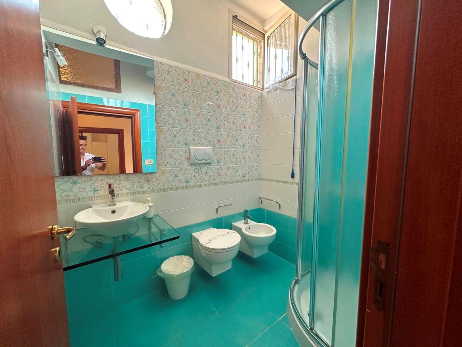 Bathroom 1: basin, toilet, bidet, shower.