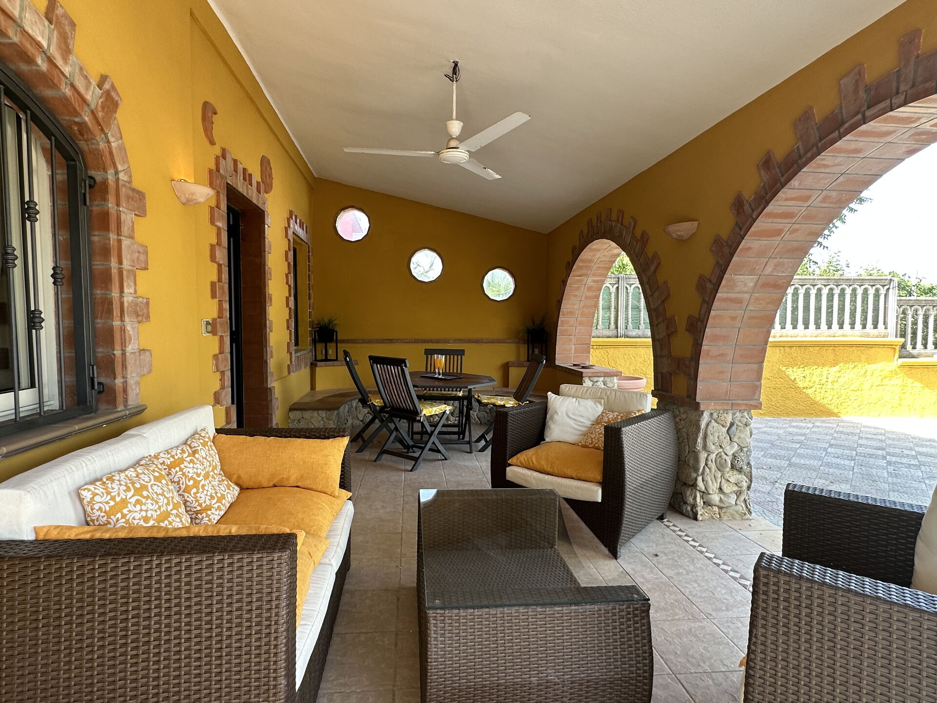 Garden: swimming pool, al fresco dining, dining table, gazebo, garden furniture, sunbed, enclosed property.