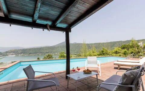 The villa is situated 4 km from the center of Trevignano Romano, Italy, and 40 km from the sea. It is 1 km away from the lake, offering easy access to various water activities. The property features a 10-meter long steep motor access and a roofed parking space for two cars. It is also equipped with electric gates, ensuring your safety and privacy during your stay.
