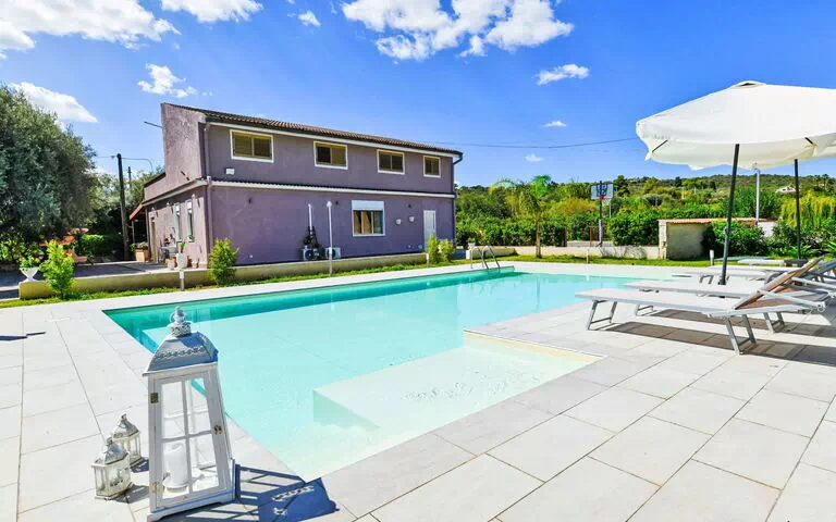 Nestled in the resort area of Floridia, Italy, just 3 km from the town center and 15 km from Siracusa, Villa "Giugiò" offers an idyllic vacation rental surrounded by lush greenery and a sunny ambiance. The private 1,200 m2 fenced property boasts a lush lawn, shady trees, and an inviting swimming pool (10 x 5 m, depth 120 - 140 cm) available seasonally from April 1st to October 31st. Enjoy the convenience of a shower/WC in the pool area, an outdoor shower, a basketball court, garden furniture, and a barbecue area. Internet Wifi, parking at the house, and heating (available from December 1st to March 31st) ensure your utmost comfort.