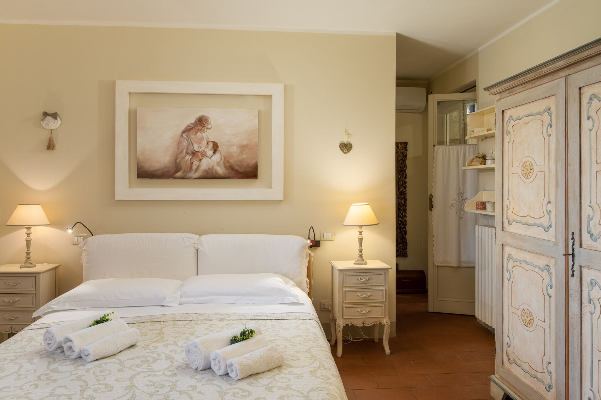 Bedroom + Ensuite Bathroom: double bed (length: 200m, width: 160m), baby bed, WIFI internet, WIFI internet, air conditioning, armchair, working desk, basin, bidet, shower, hairdryer, exit to the garden.