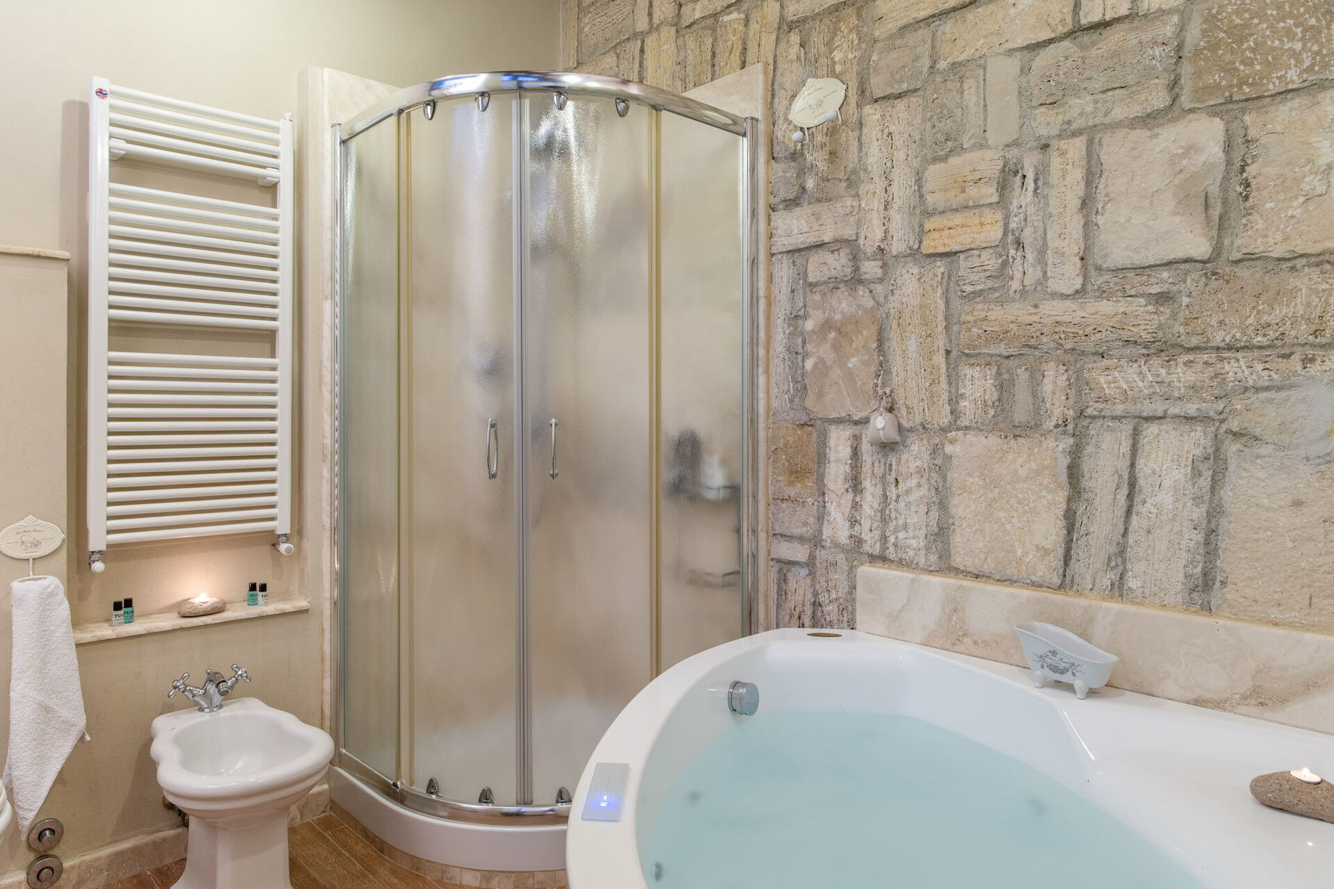 Bedroom + Ensuite Bathroom: double bed (length: 200m, width: 160m), WIFI internet, air conditioning, armchair, fireplace, whirlpool bathtub, double basin, bidet, shower, hairdryer.