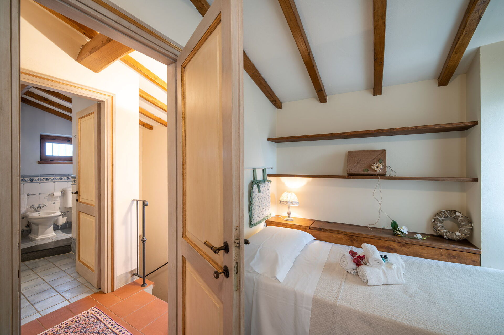 Bedroom + Ensuite Bathroom: double bed (length: 190m, width: 160m), WIFI internet, internet, basin, bidet, shower, hairdryer, bathroom with no window, exit to the garden.