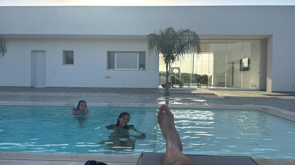 Garden: swimming pool (private, length: 11m, width: 4m, depth: 1.3m, outdoor), shower, barbecue, al fresco dining, dining table (people: 6), gazebo, garden furniture, sunbed, fenced, enclosed property.