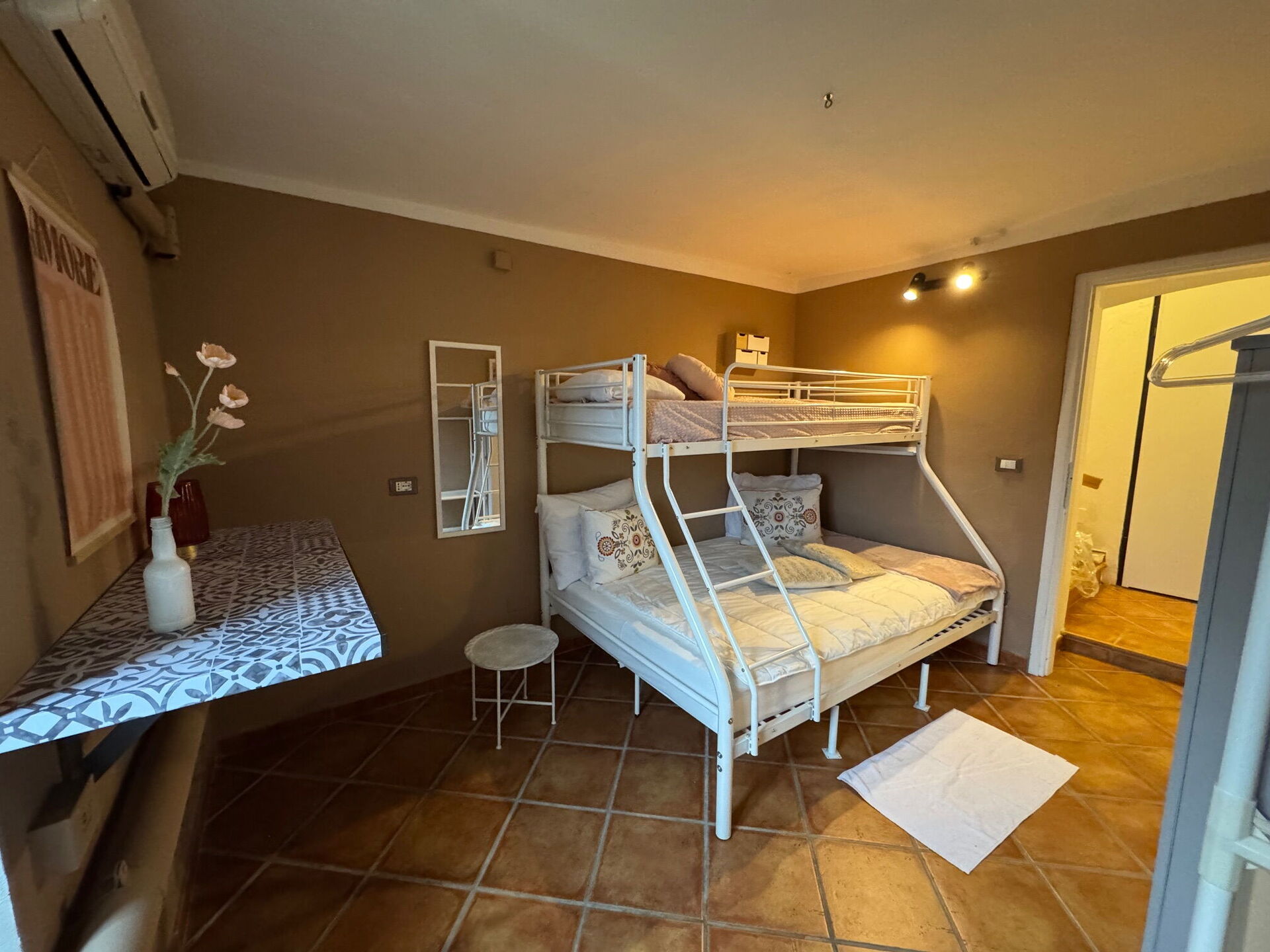 Bedroom 2 (10 m2): bunk bed, portable fan.