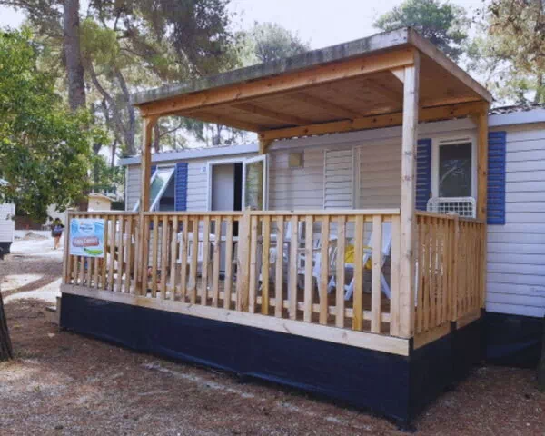 The "Happy Comfort" is a 3-room mobile home with a total area of 25 m2, suitable for accommodating 4 adults and 1 child on vacation. The living/sleeping room features a sleeping facility (120 cm wide and 200 cm long), a dining table, electric heating, and air conditioning. There is one room with a french bed (140 cm wide and 190 cm long), and another room with two beds (70 cm wide and 190 cm long). The open kitchen is equipped with 4 hot plates.