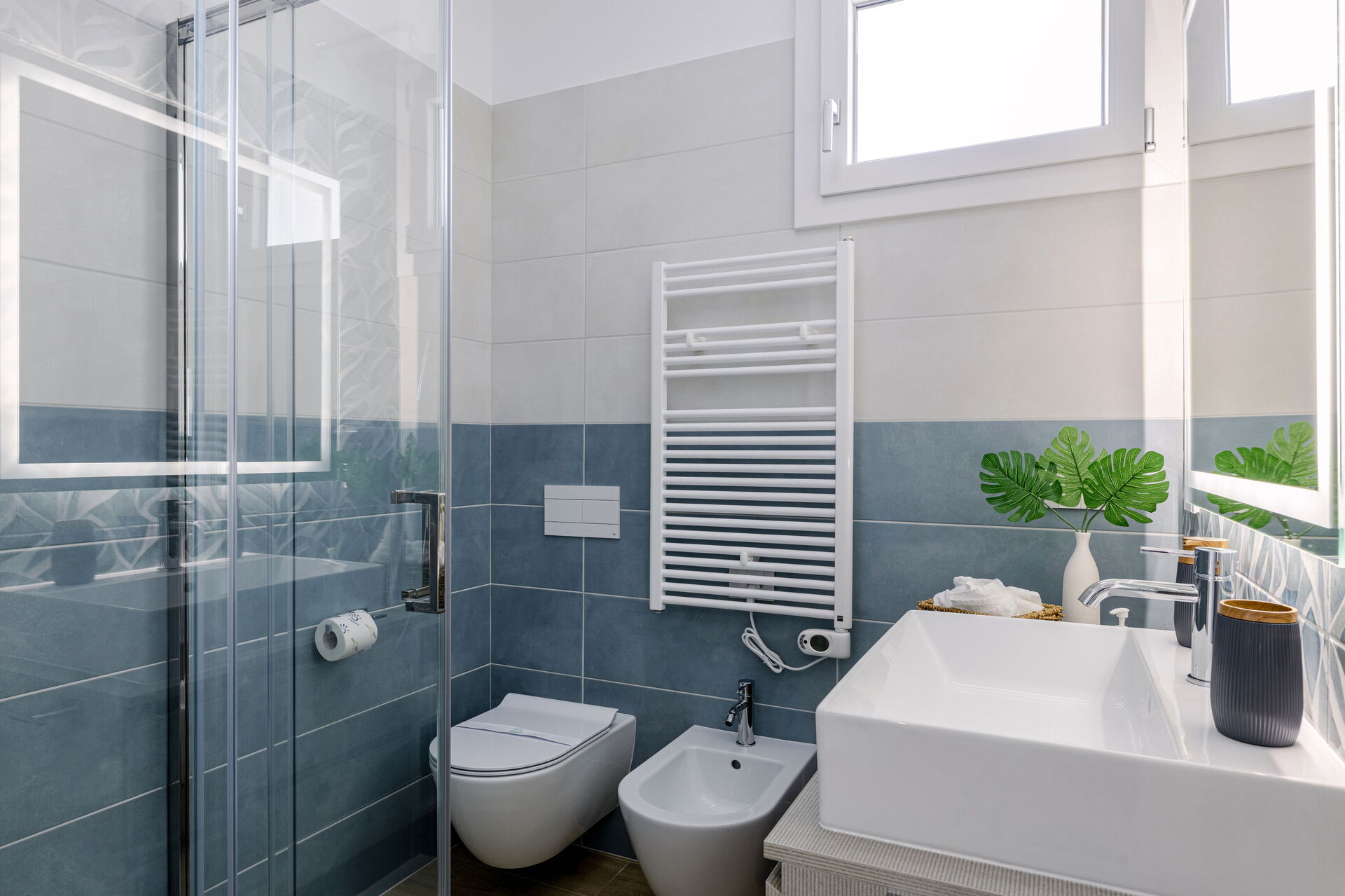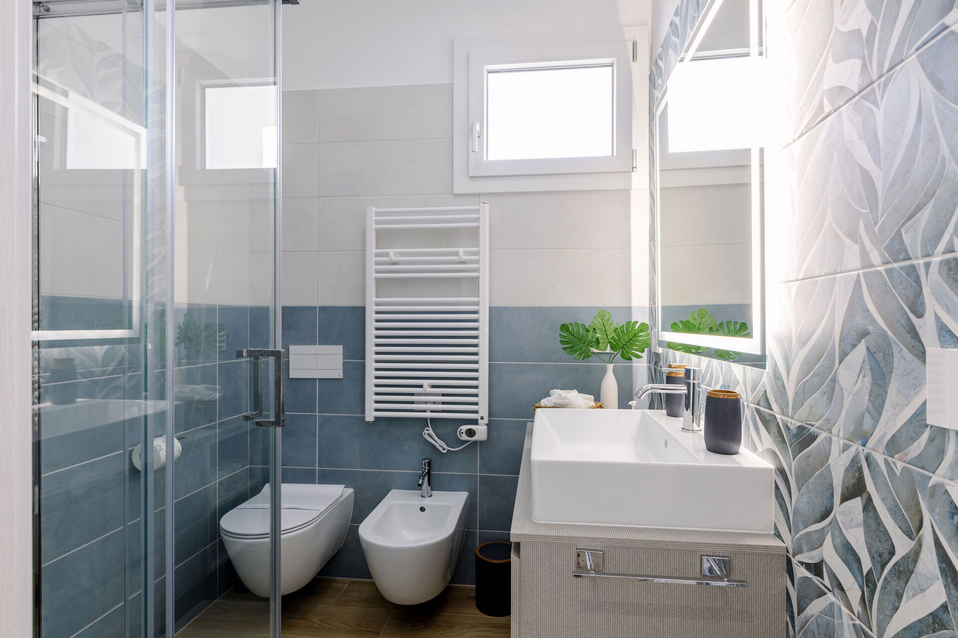 Bathroom: basin, toilet, bidet, shower, hairdryer.