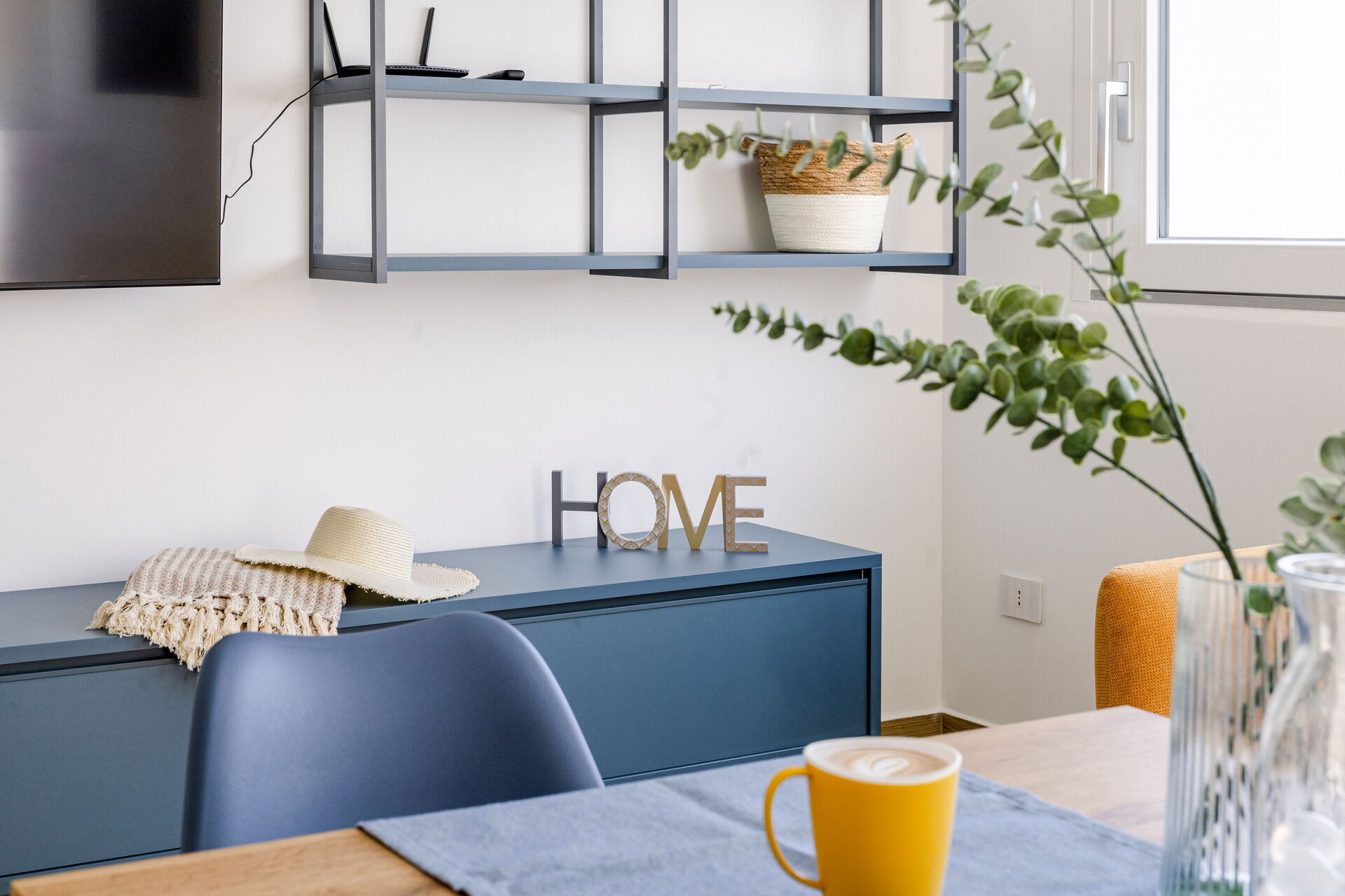 Kitchen + living room: well equipped kitchen, dining table, dishwasher, fridge, freezer, stove top, oven, toaster, sofa, WIFI internet, internet, air conditioning, television, smoke detector, co2 detector, exit to the terrace.