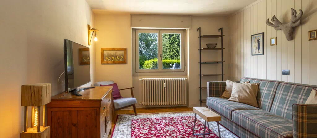 Your vacation home features a spacious 60 m2 2-room apartment situated on the ground floor with a south-facing orientation. The living/dining room offers a double sofabed, dining table, and dining nook. The apartment includes one double bedroom with a dressing room, and a fully equipped kitchen. The bathroom features a shower, bidet, and WC. Beautiful parquet floors run throughout the apartment, and you can enjoy views of the mountains and garden from the windows.