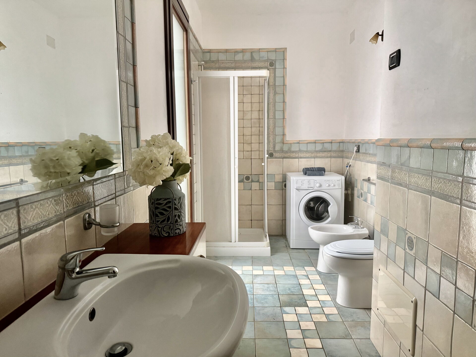 Bathroom: basin, bidet, shower, hairdryer, washing machine.