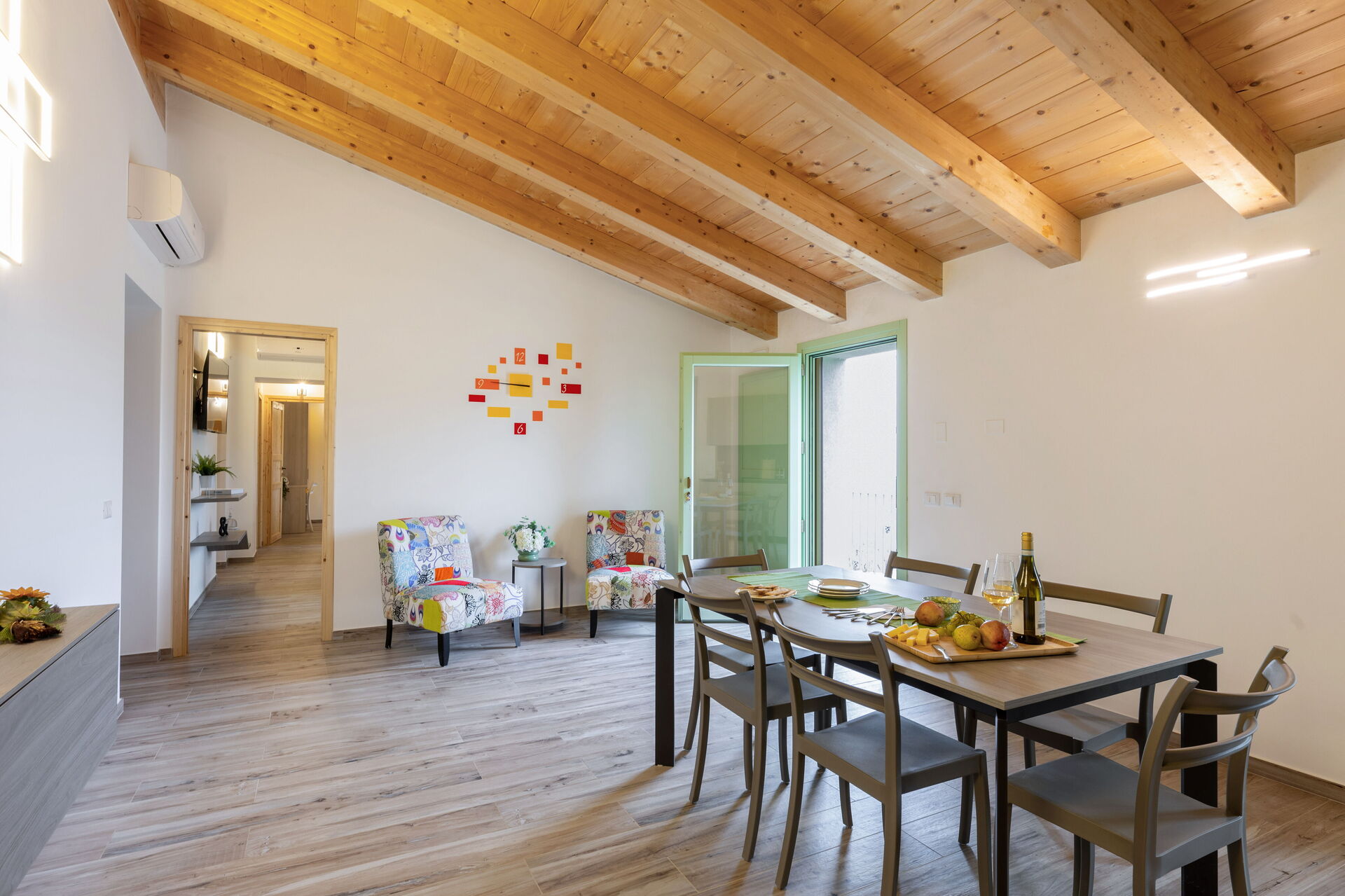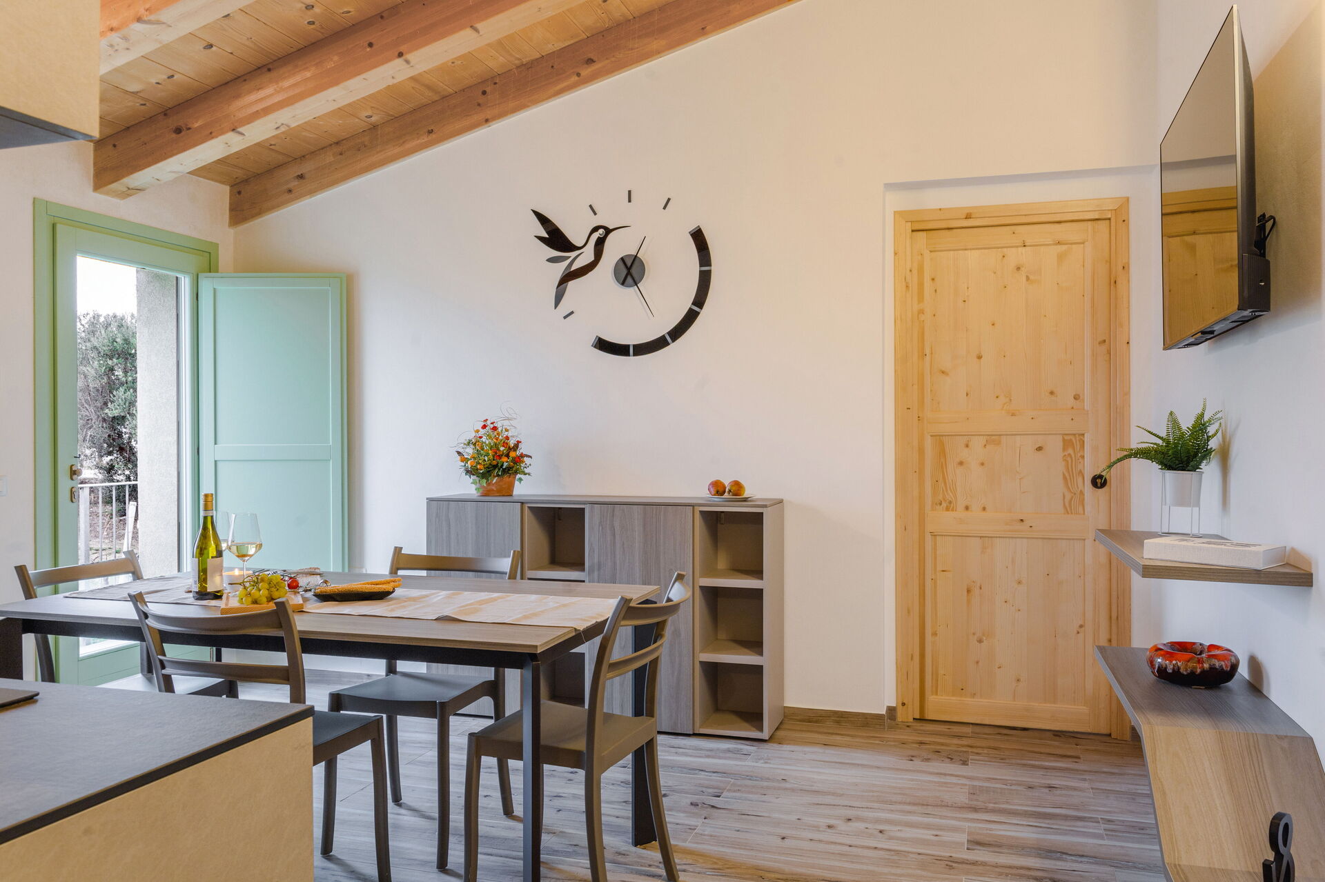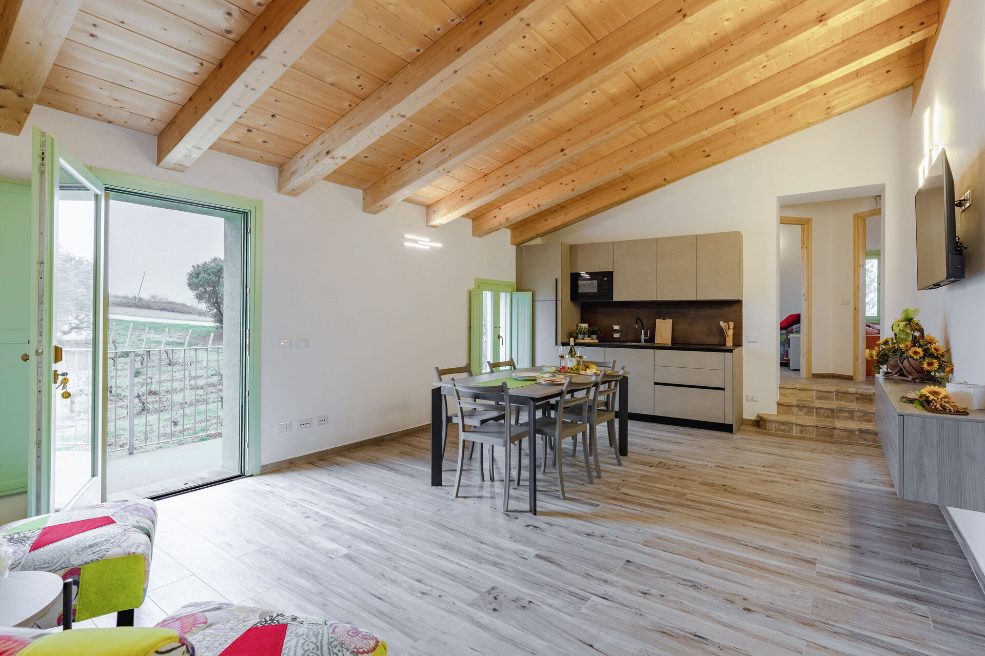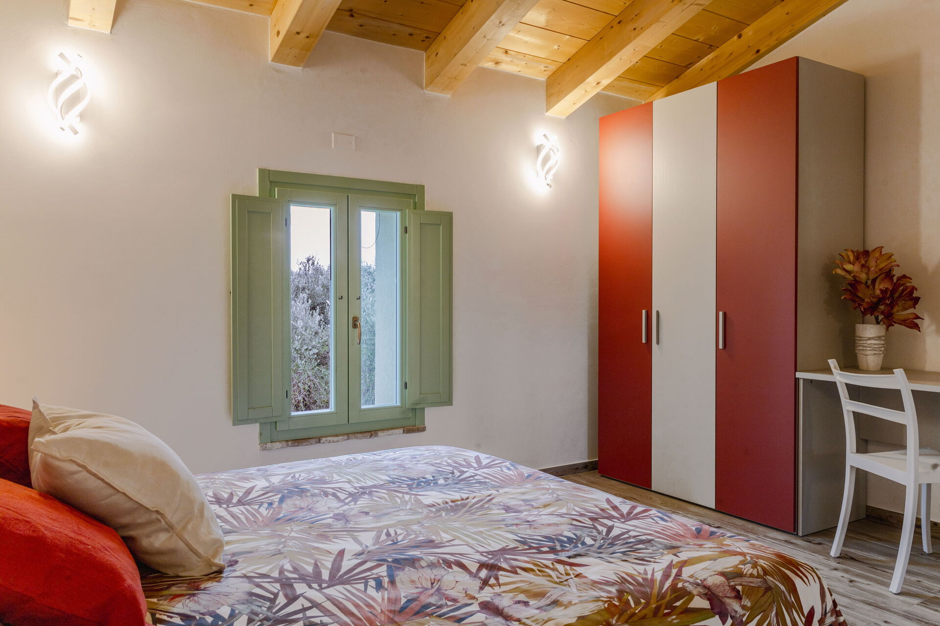 Kitchen + living room: well equipped kitchen, dining table, dishwasher, fridge, freezer, microwave, stove top, oven, italian coffee machine, two armchairs, WIFI internet, air conditioning, mosquito net, satellite tv, smoke detector, co2 detector, exit to the garden.