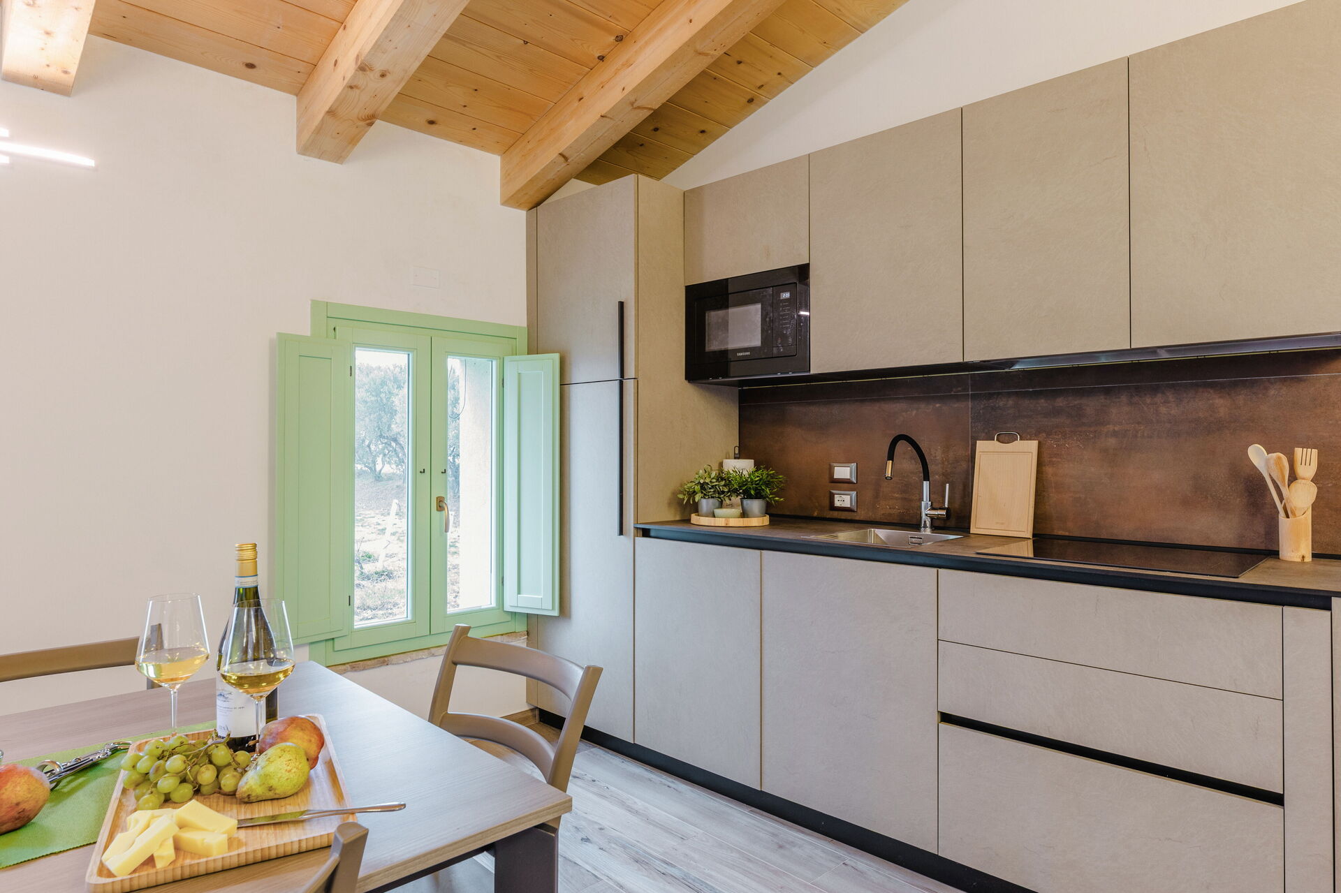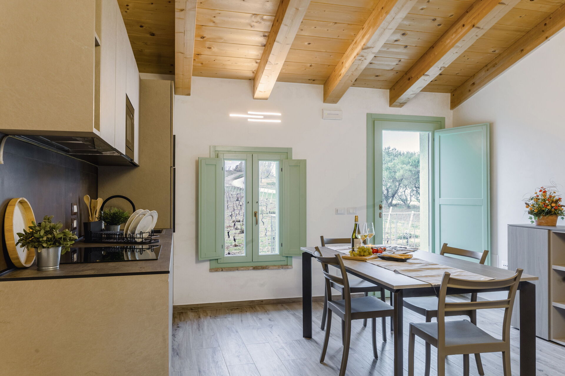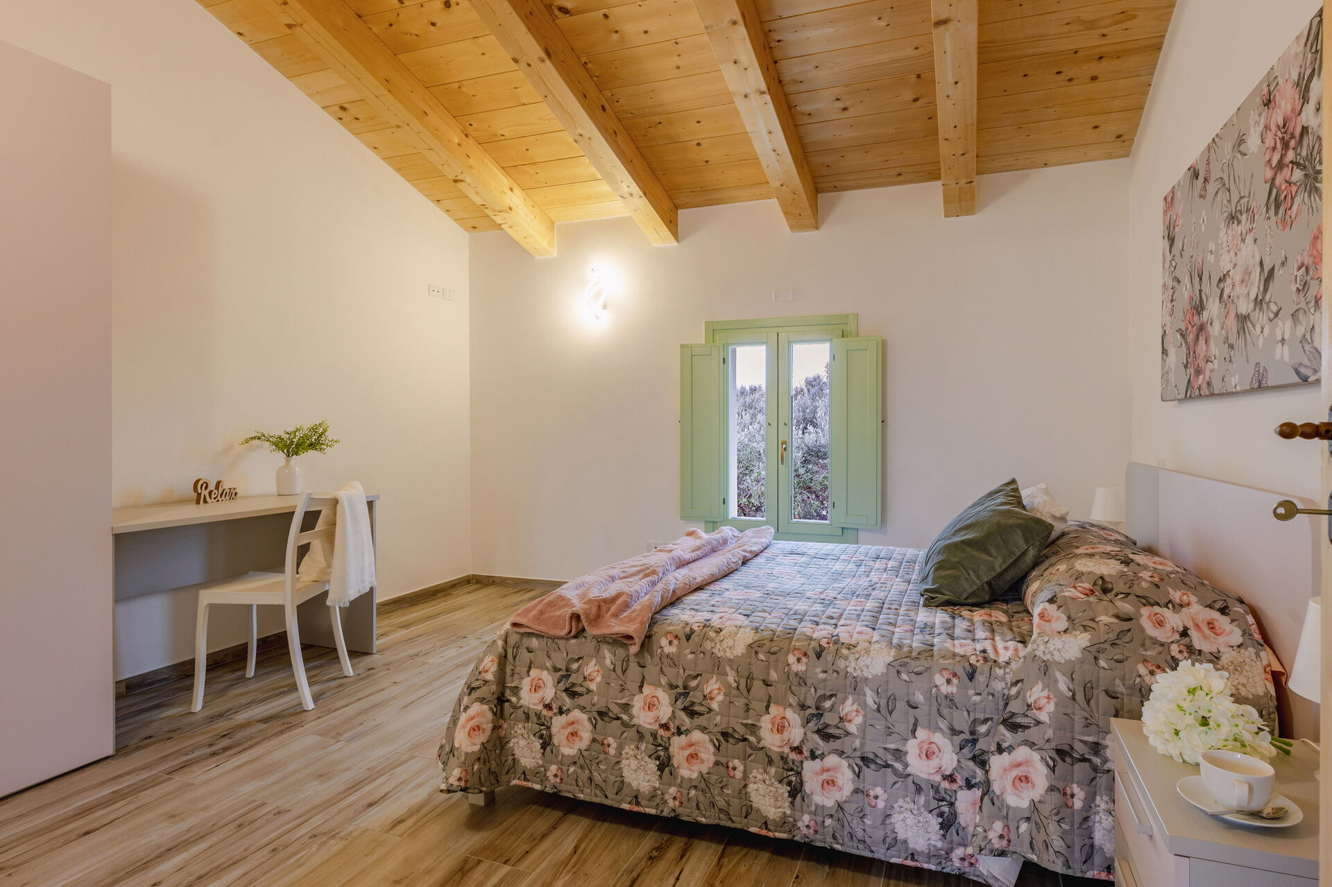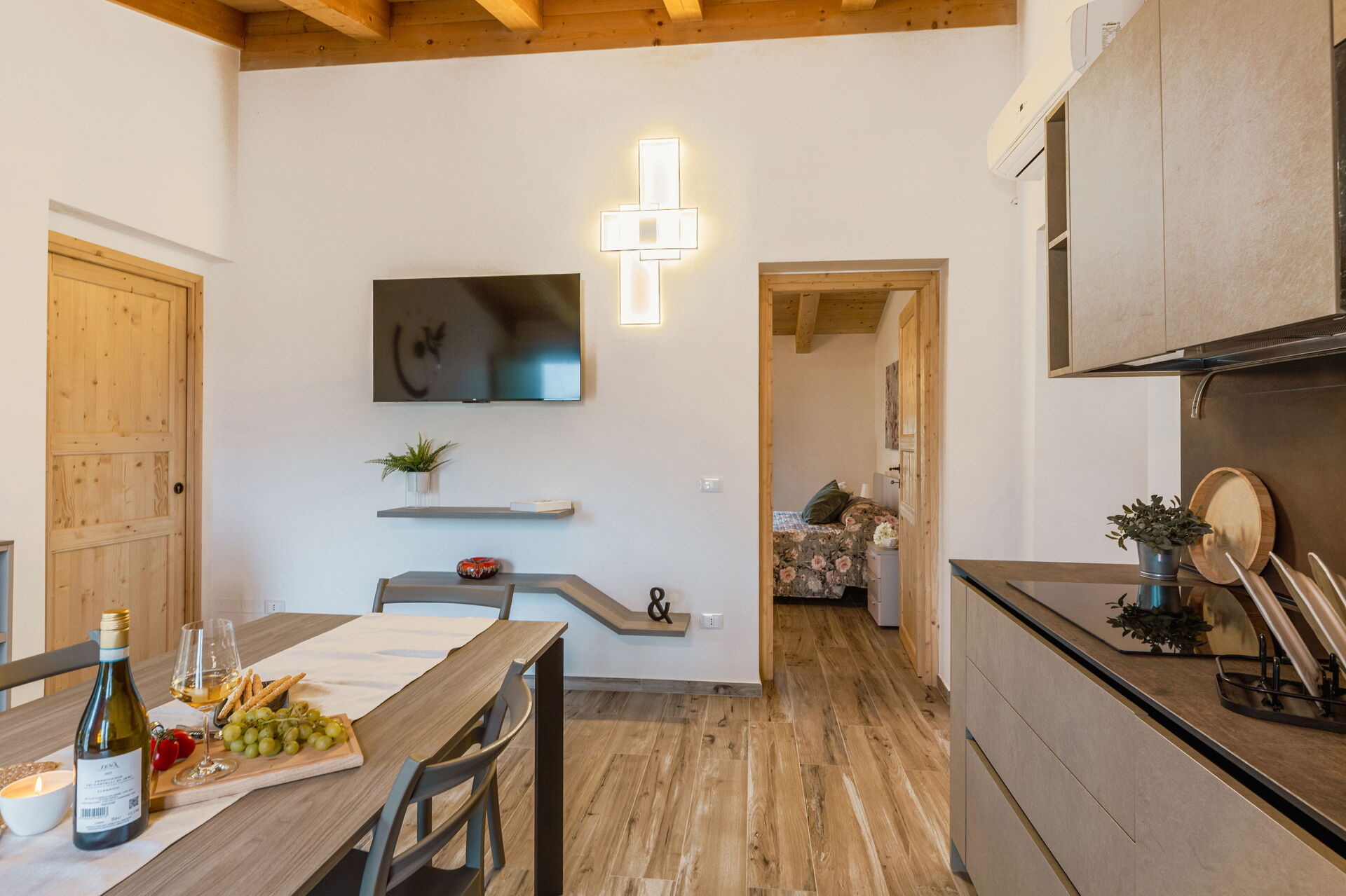Kitchen + living room: well equipped kitchen, dining table, dishwasher, fridge, freezer, microwave, stove top, oven, italian coffee machine, two armchairs, WIFI internet, air conditioning, mosquito net, satellite tv, smoke detector, co2 detector, exit to the garden.