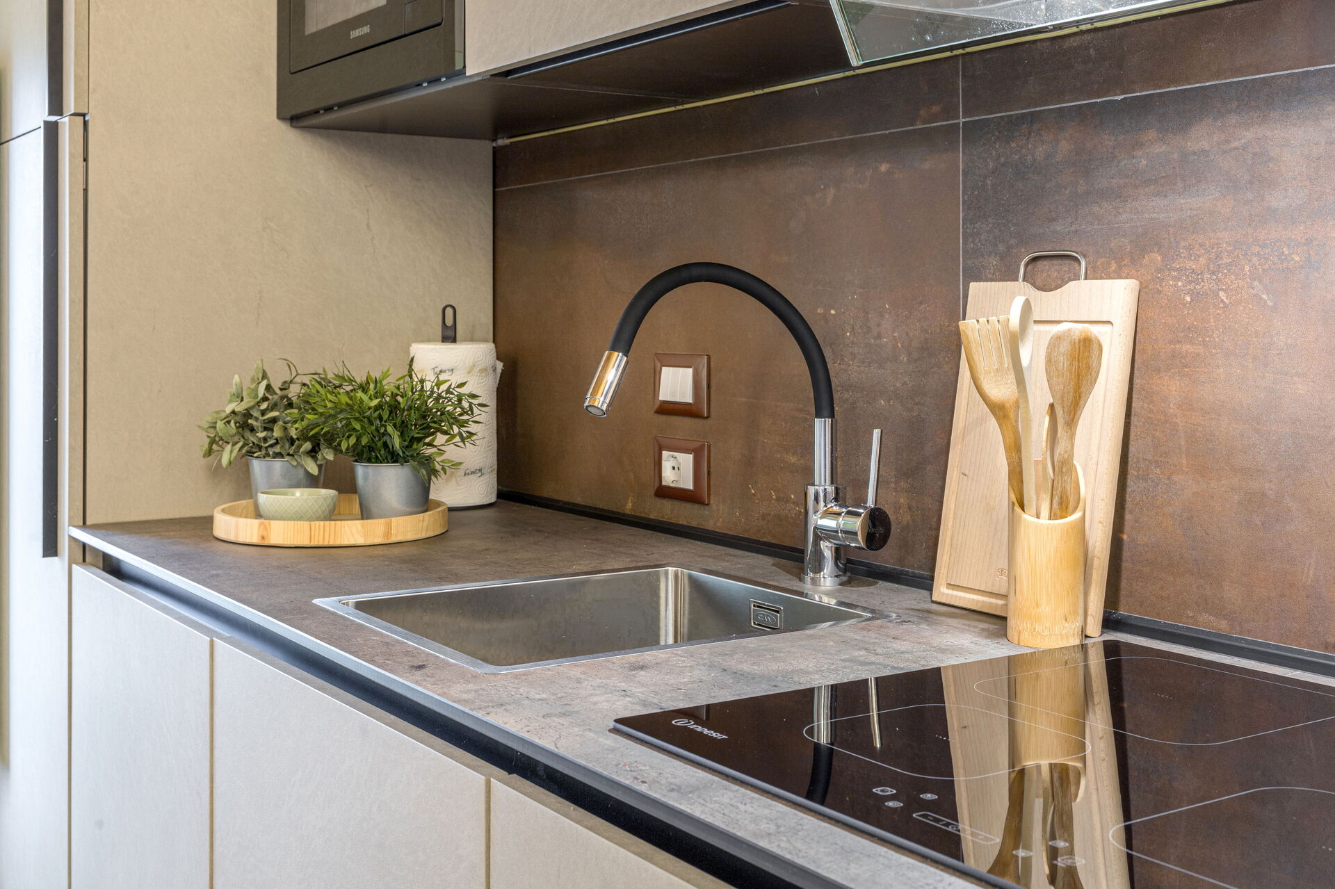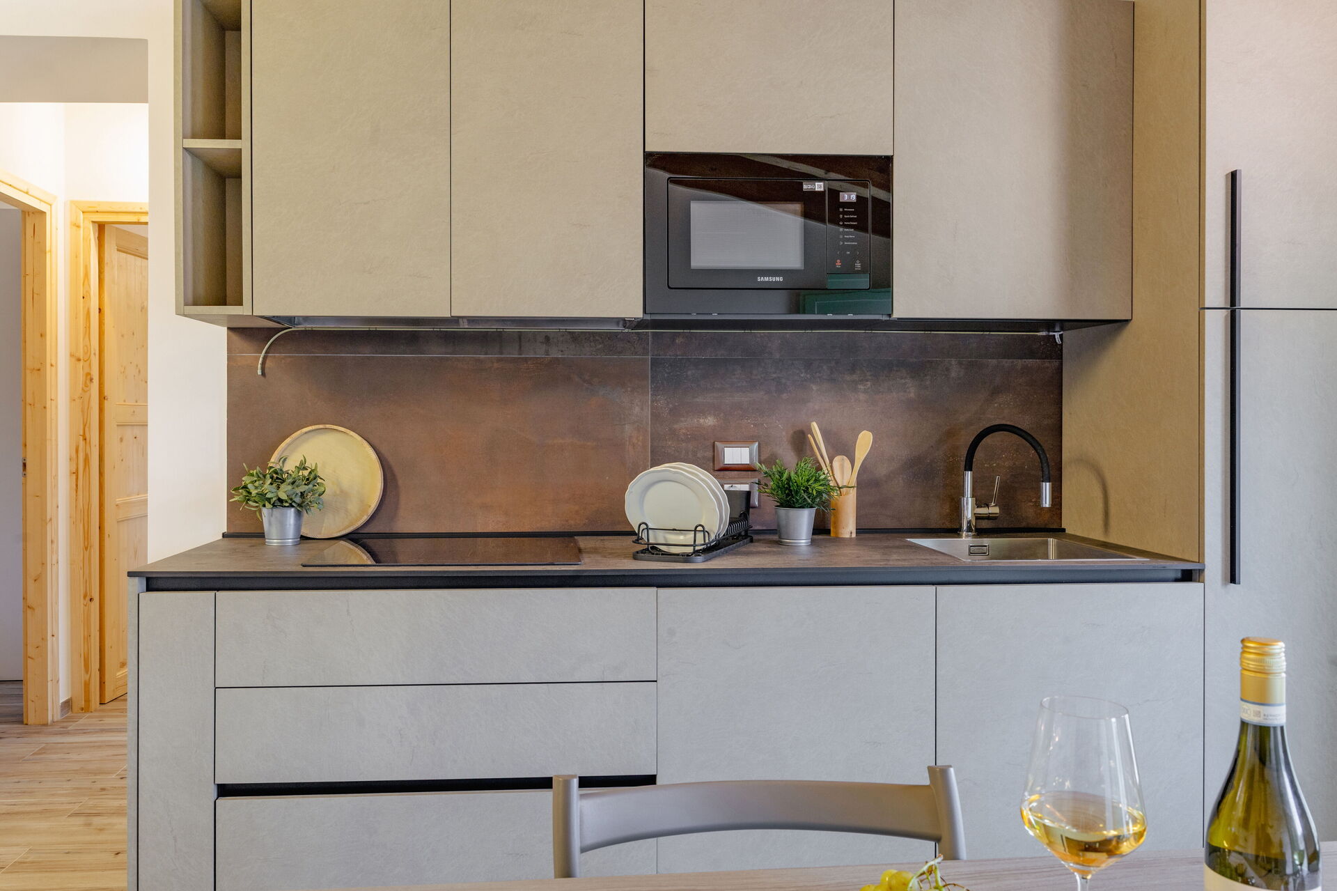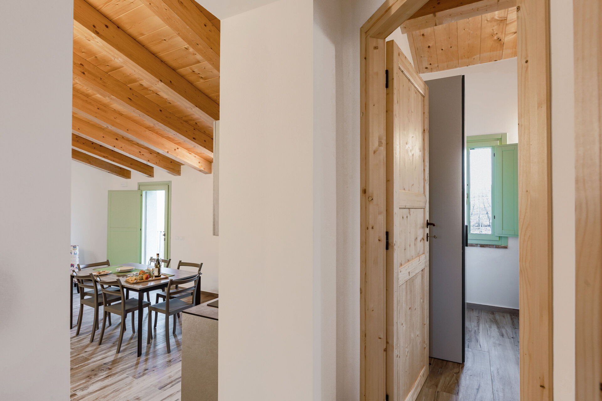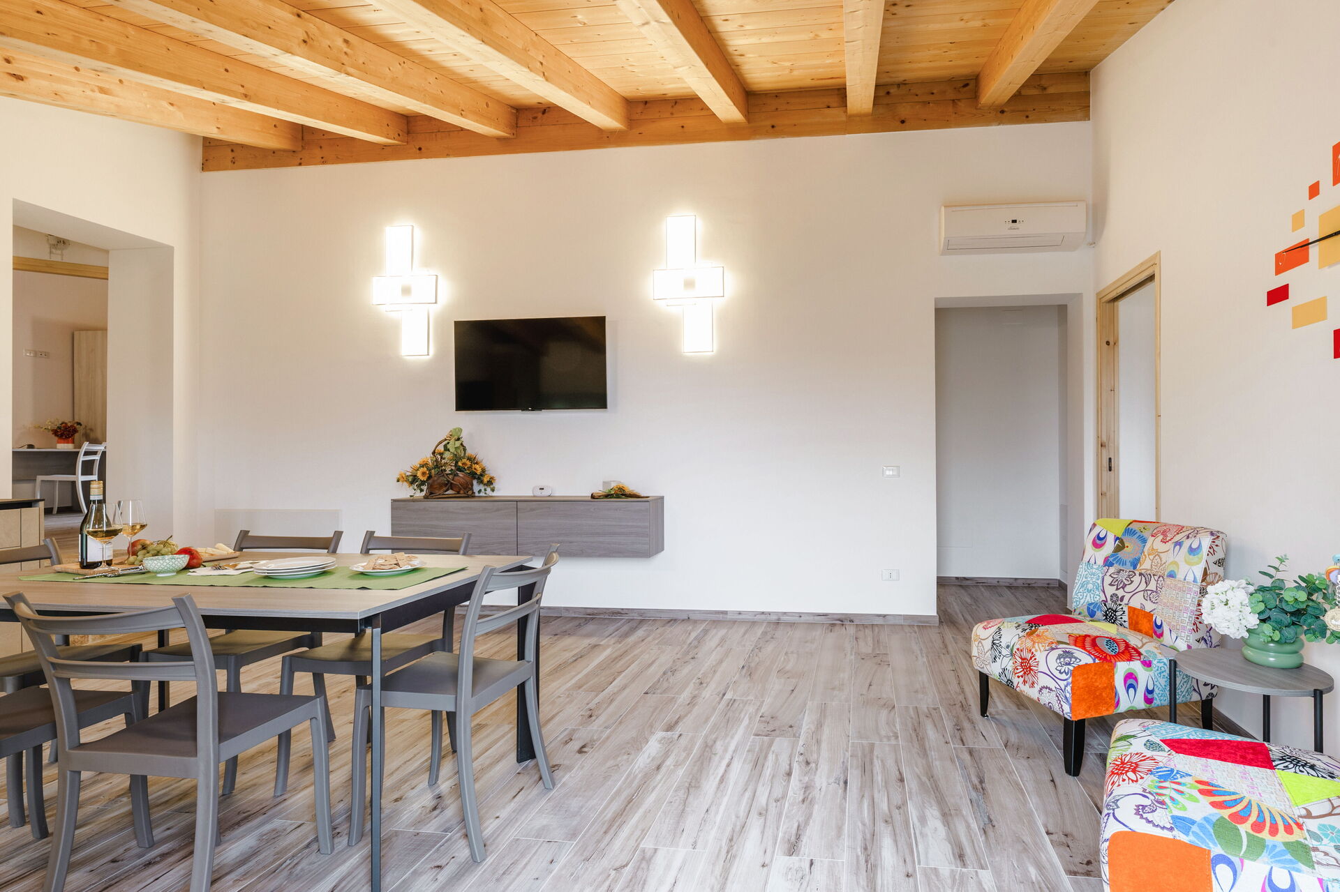 Kitchen + living room: well equipped kitchen, dining table, dishwasher, fridge, freezer, microwave, stove top, oven, italian coffee machine, two armchairs, WIFI internet, air conditioning, mosquito net, satellite tv, smoke detector, co2 detector, exit to the garden.
